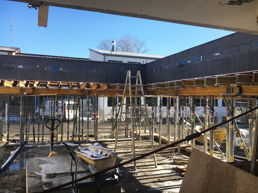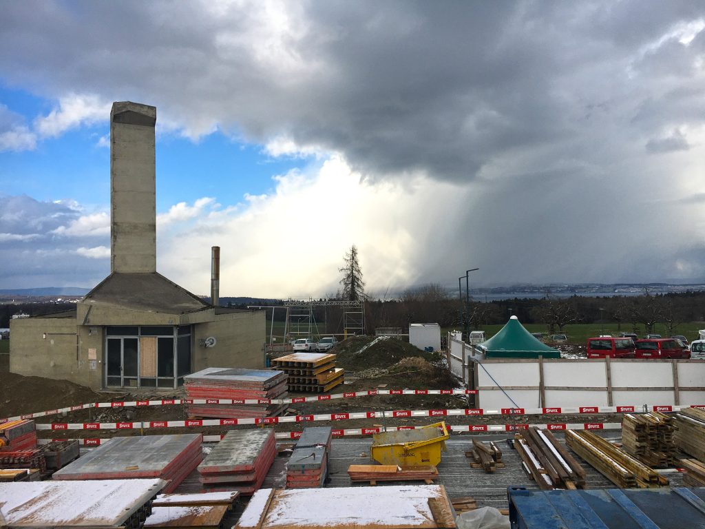 Mehrzweckgebäude am Ekkharthof – Die Deckenplatte ist betoniert und die nun erlebbare Aussicht aus dem zukünftigen Saal zeigt sich von ihrer dramatischen Seite.