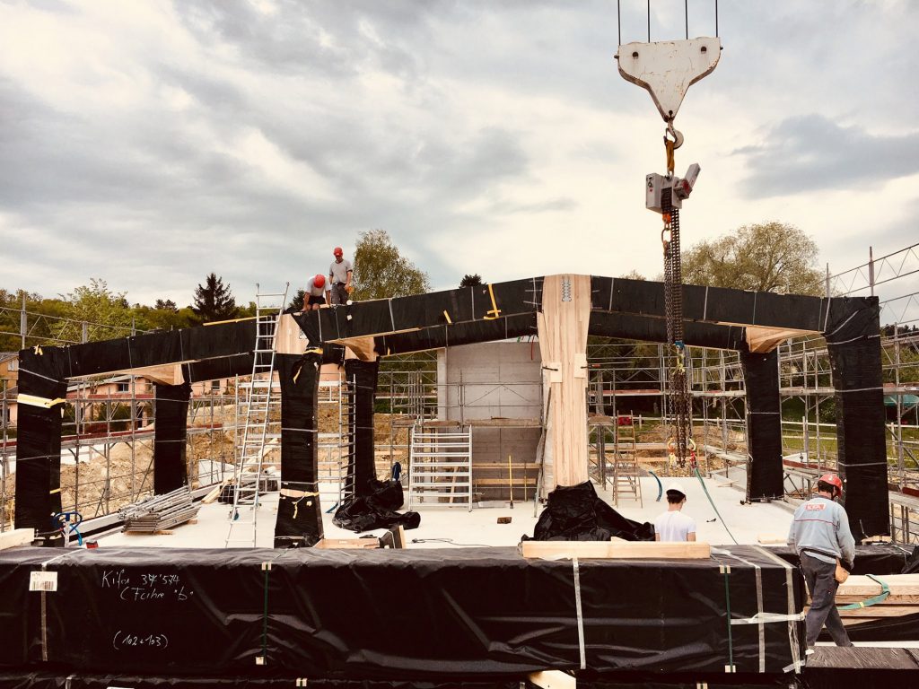 Das Aufrichten des Holzfachwerks hat heute begonnen.