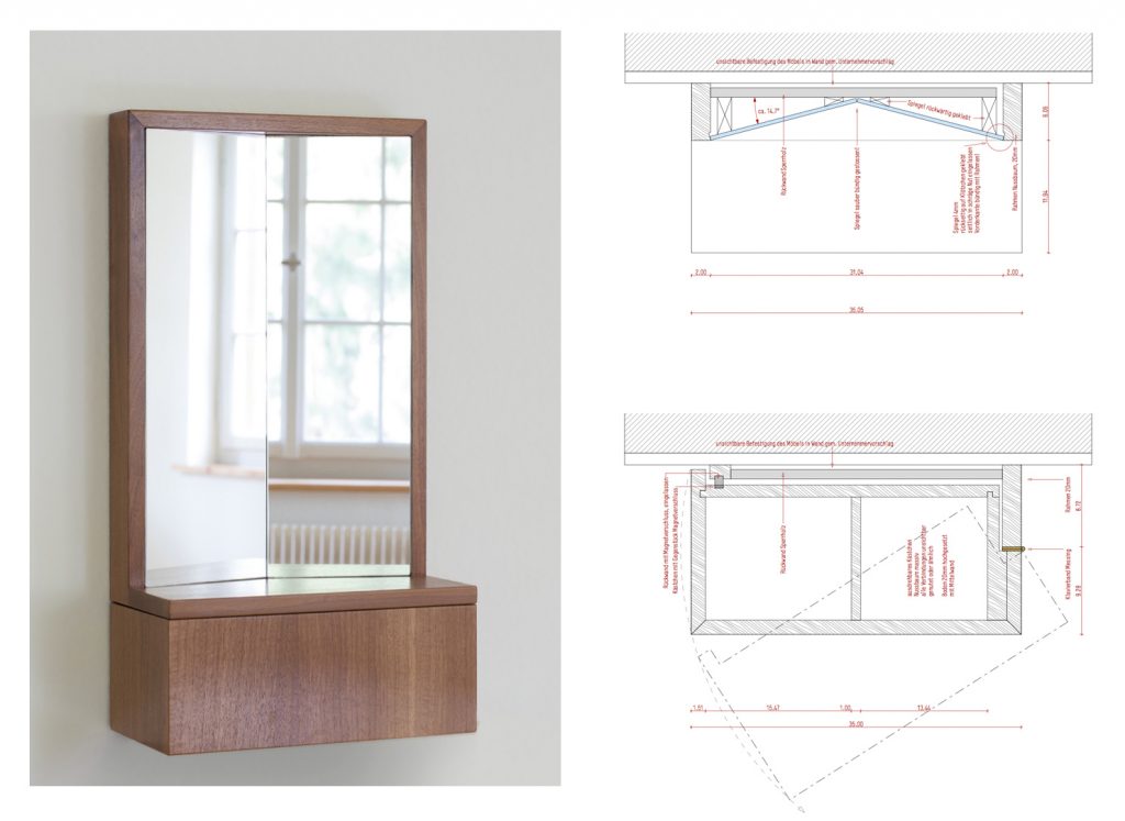 Hannes Heinzer photographiert dieser Tage einige ältere Eingriffe im Haus H. in Kesswil. Dabei ist uns dieses Garderobenmöbelchen aus Nussbaum (für Schlüssel und ähnliches) wieder aufgefallen. Wir hatten es so entworfen hatten, dass man sich nicht sieht, wenn man davorsteht. Man wird weggespiegelt.