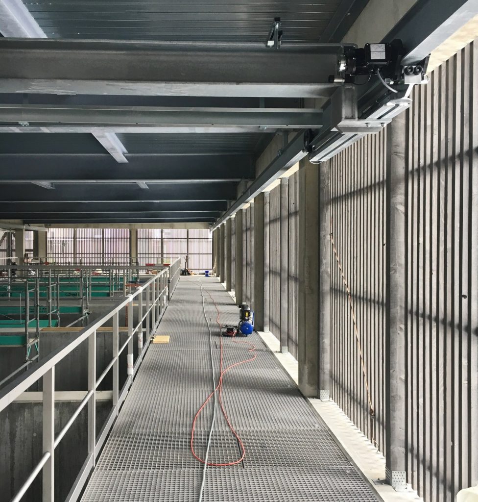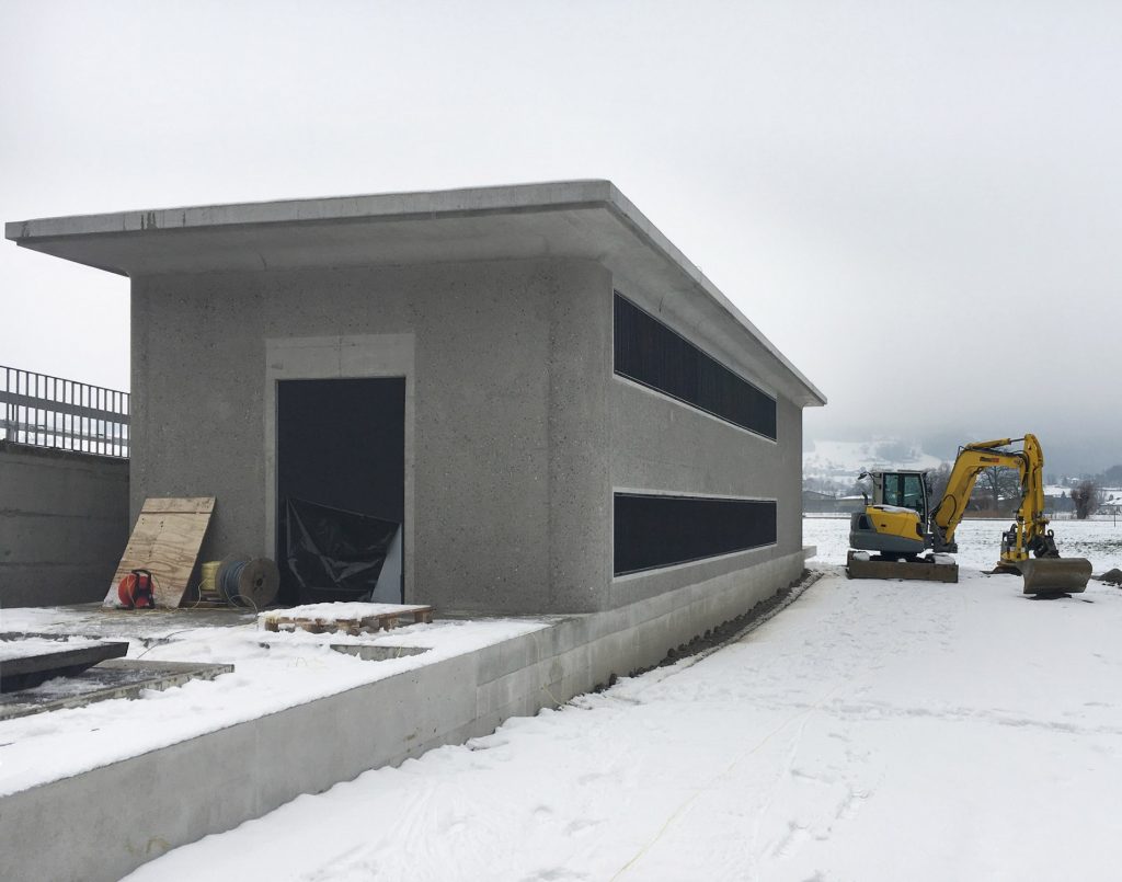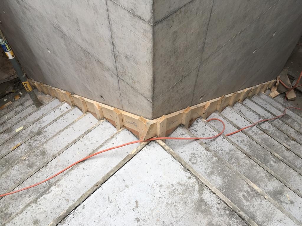 Der Schalungsplan wurde versehentlich gespiegelt. Um genügend nutzbare Treppenbreite in das Bestandesgebäude integrieren zu können, teilt sich der untere Treppenlauf in zwei Wege auf. (Ein breiter Lauf wird zu zwei schmalen, die jeweils einen der beiden Korridore erschliessen und auf dem Podest zusammengeführt werden.)