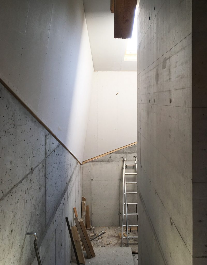 Der Einbau eines neuen Treppenhauses in einen bestehenden Gebäudeteil durchstösst das bestehende Dach und erschliesst so auch das neu ausgebaute Dachgeschoss.