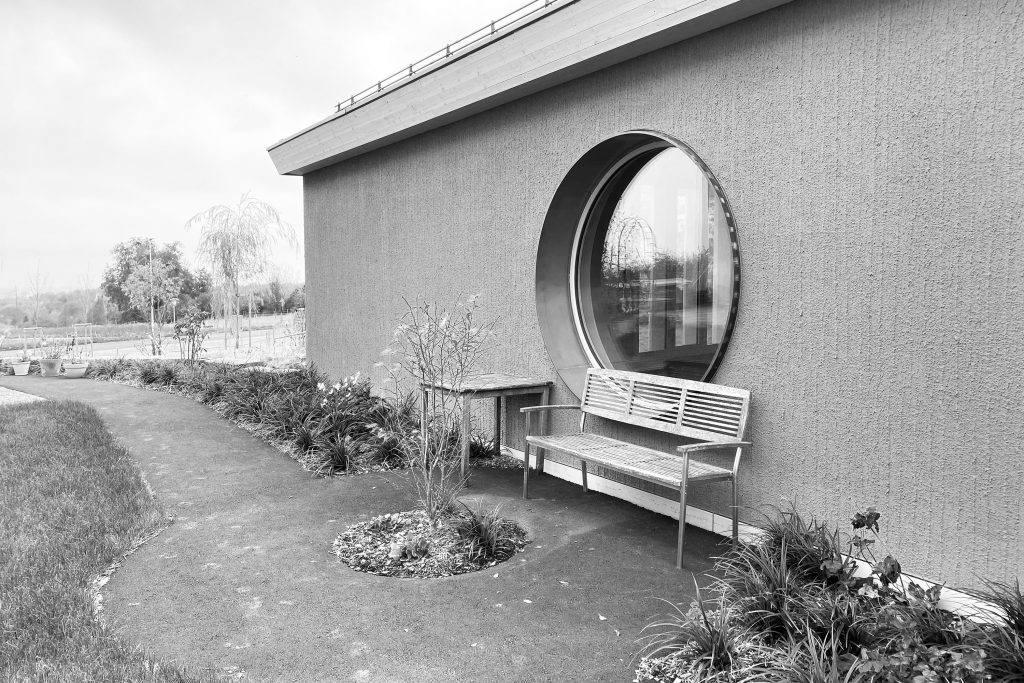 Und so gingen Carlos Wilkening und ich letzte Woche nach der letzten Sitzung der Baukommission über das herbstlich stille Gelände des Ekkharthofs und freuten uns am reellen Leben, das dort Einzug gehalten hat. Als eine der letzten Baumassnahmen wurde der kleine Garten der Wohngruppe für ältere Leute nach den Plänen von Markus Cukrowicz fertiggestellt. Das Guckloch, das sich die Bewohnerinnen gewünscht hatten, um von oben den Betrieb in unserer Turnhalle zu beobachten, hat der Landschaftsarchitekt an den Boden gespiegelt und so auf dem Rundgang durch den Garten einen kleinen, besonderen Ort geschaffen. Die Bewohnerinnen und Bewohner würden ihren neuen Garten sehr schätzen, wurde uns gesagt.