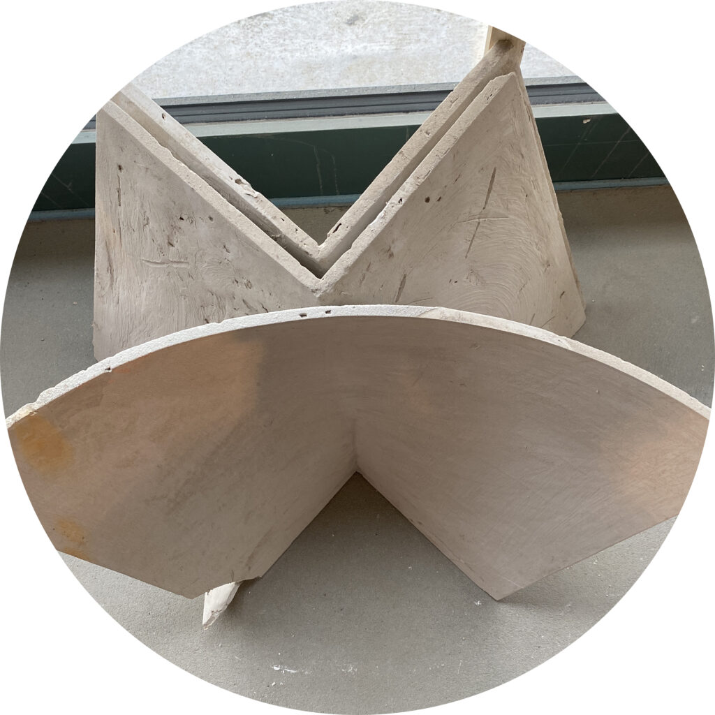 Gipser, welche diese Form in Gips bauen können, sind allerdings schon schwieriger zu finden. (Die Firma Tinella kann es.) Im Bild die ersten Muster. Hergestellt werden sie im Gussverfahren – allerdings nicht in einer Hohlform, sondern indem flüssiger Gips über eine CNC-gefräste Form gegossen und immer wieder mit Netzen armiert wird. Millimeter für Millimeter wachsen so die einzelnen Viertelkreisformstücke heran, die dann auf dem Bau montiert und verspachtelt werden. Hier ein Film dazu.
