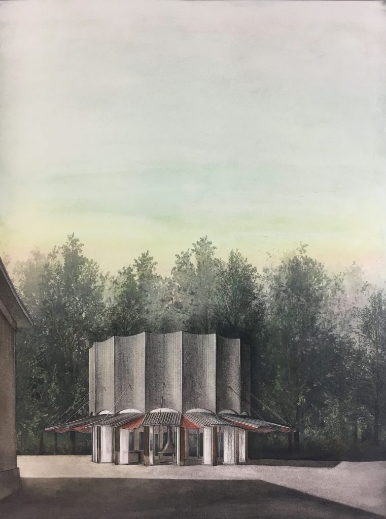 Wir haben für diese Benefizauktion eine der wenig erhaltenen Jaxon-Bilder aus unserem Archiv gespendet. Es handelt sich um eine frühe Entwurfsdarstellung unseres «Folly am Waldrand», das als Infopavillon für die Kläranlage Altenrhein dient.