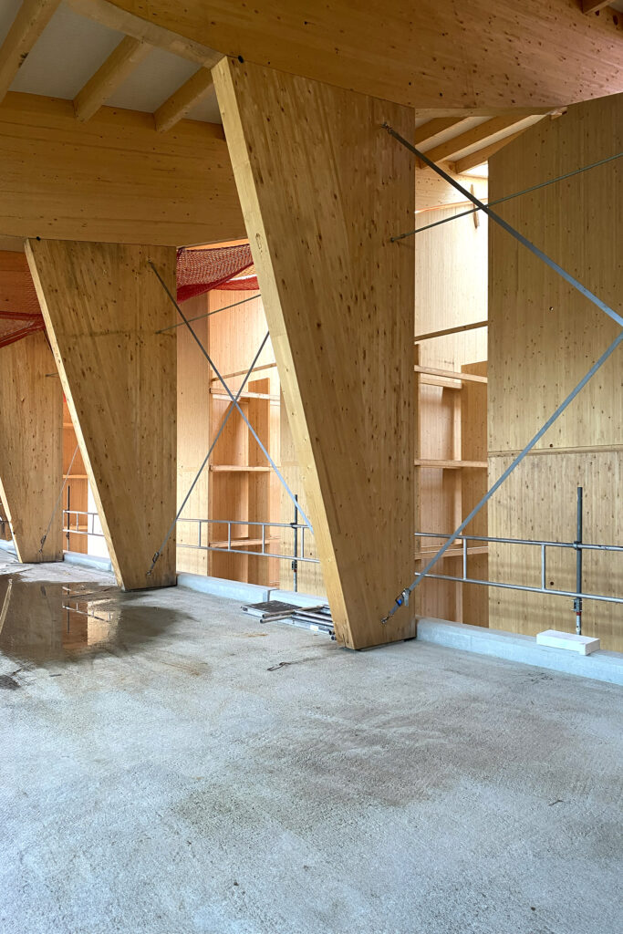 Im August dieses Jahres aber war das Holz nun bereit, die Teile produziert, das Fundament erstellt und das Aufrichten konnte beginnen. Beindruckend, wie pro Achse zwei Binder gleichzeitig von Pneukranen in Position gehoben, aneinander gestützt und im Firstpunkt verschraubt wurden. (Die Halle ist bewusst so konzipiert, dass in den Hochregallager keine tragenden Stützen oder Wände integriert sind, sodass sie in Zukunft auch anders genutzt werden könnte. Die auf den Bildern erkennbare, dünne Holzwand unter den Bindern trägt nicht, sondern ist dem Brandschutz der Hochregallager geschuldet, in denen hochprozentige Alkoholika gelagert werden.)