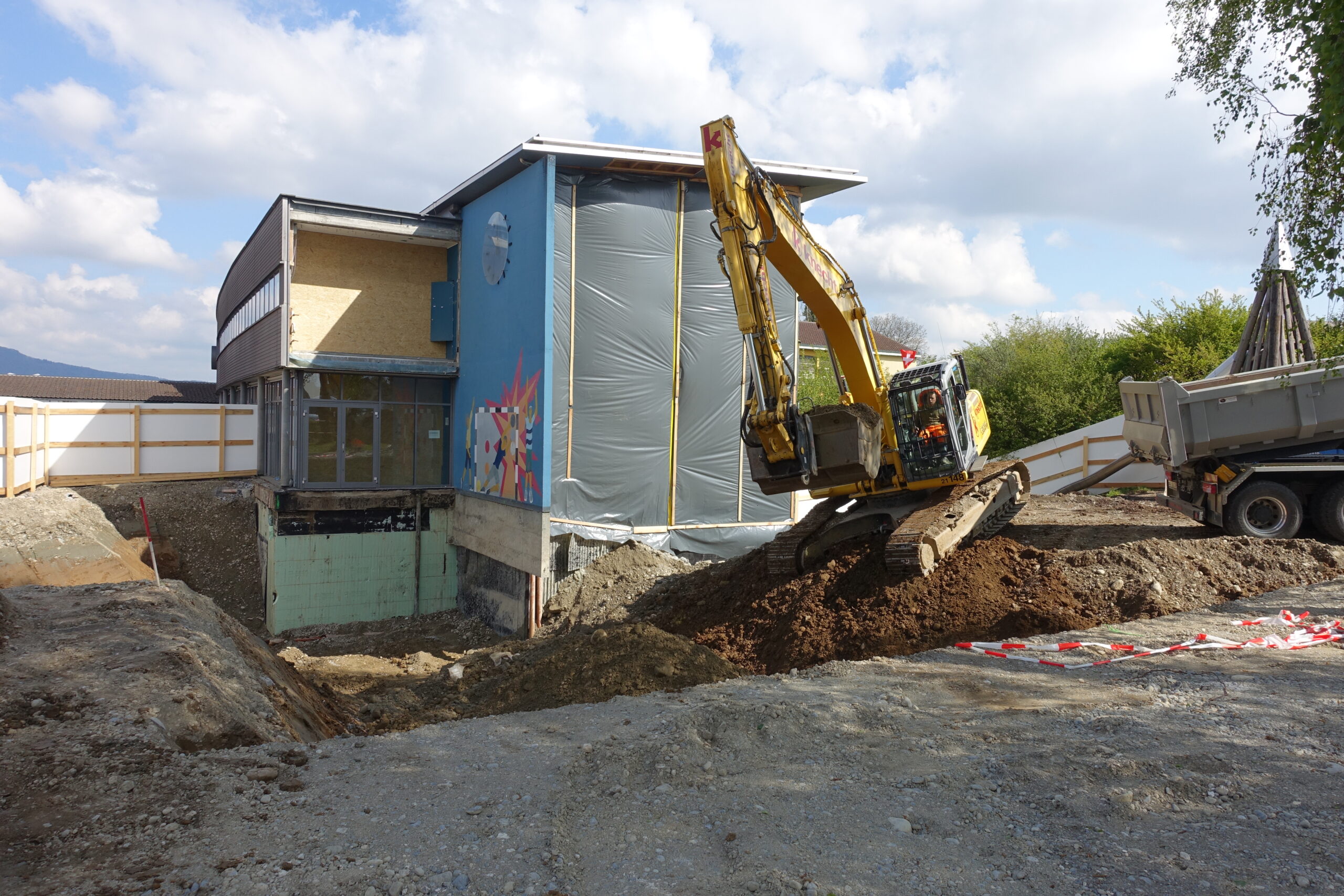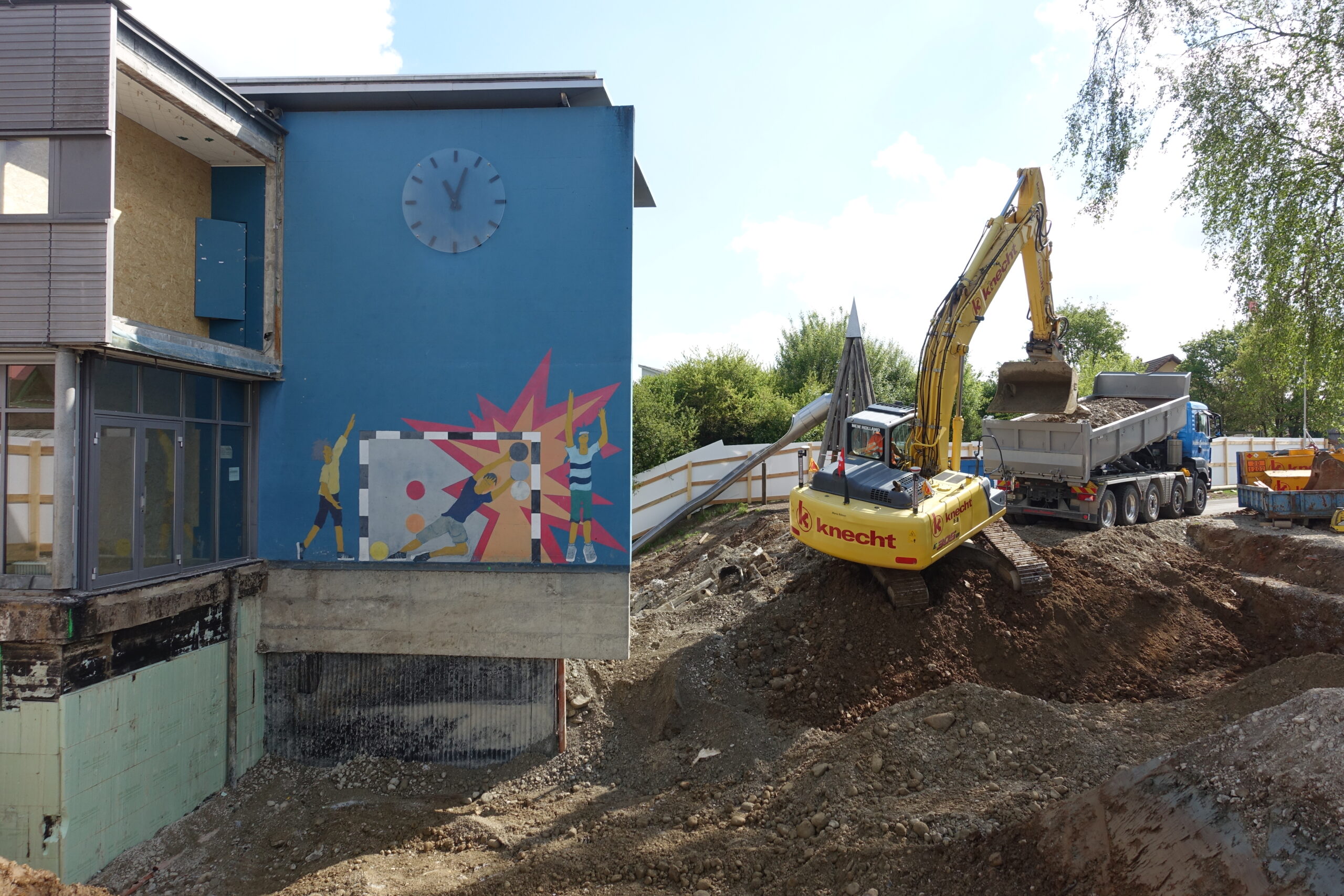 Das Bestandesgebäude wird angeschnitten und der Raum für unsere Ergänzung ausgegraben. Die nicht mehr benötigten Metallverkleidungen der Stirnfassade wurden sorgfältig demontiert und zwischengelagert. Sie werden später zur nahtlosen Erweiterung des Korridors benutzt werden.)