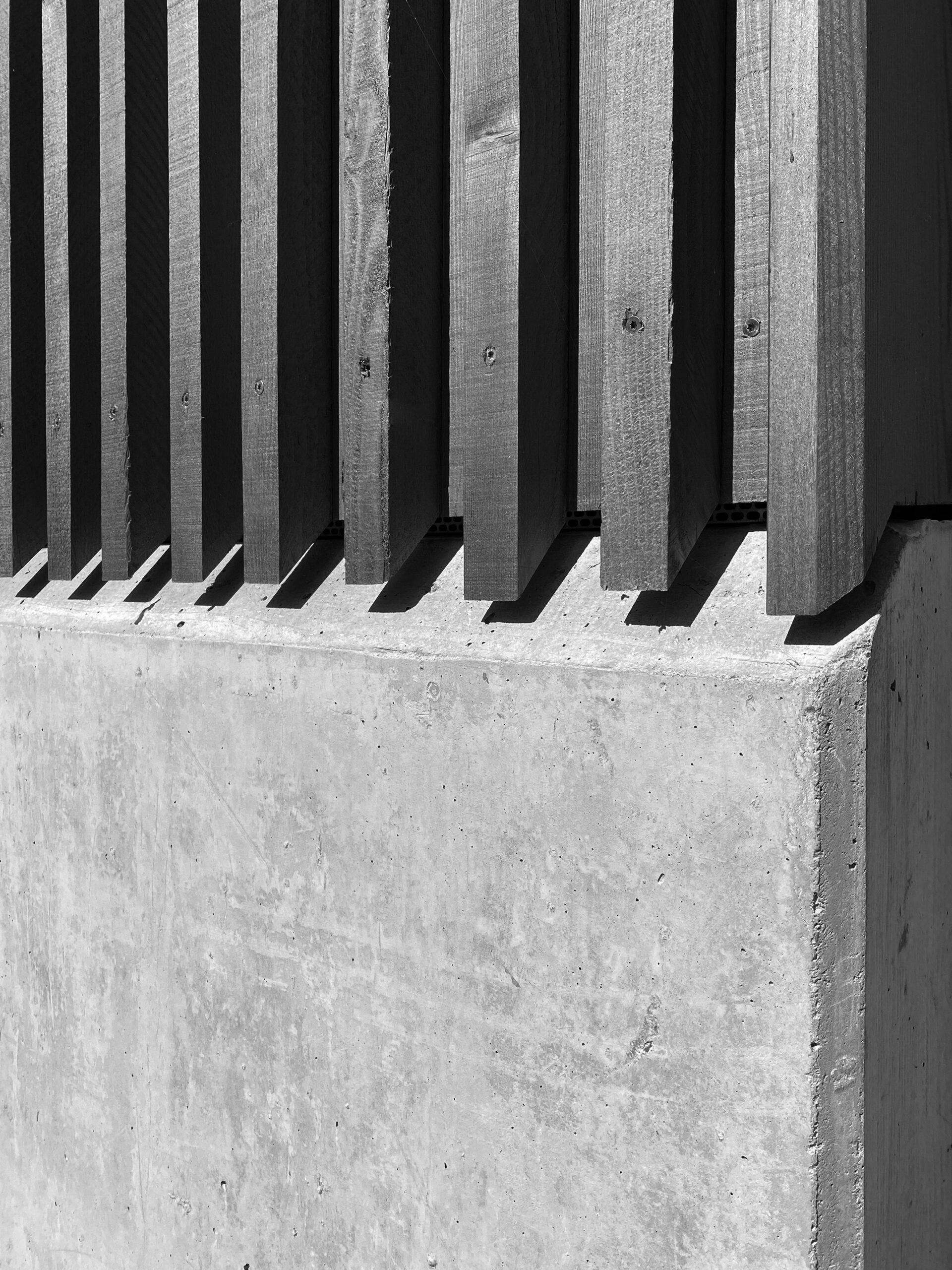 Affirmativ haben wir uns daher entschieden, dieses holzbautechnische Detail zum gestalterischen Prinzip zu machen. Mit einem 45°-Winkel oder, wenn man so will, einer extrem grossen Dreikantleiste, schliesst der Sockel nach oben ab. Die Holzlatten werden unten entsprechend angeschnitten und verzahnen sich so optisch mit dem Betonsockel. Besonder schöne Details entstehen dort, wo die horizonalte 45°-Schräge mit der kleineren, vertikalen Dreikantleiste zusammentrifft.