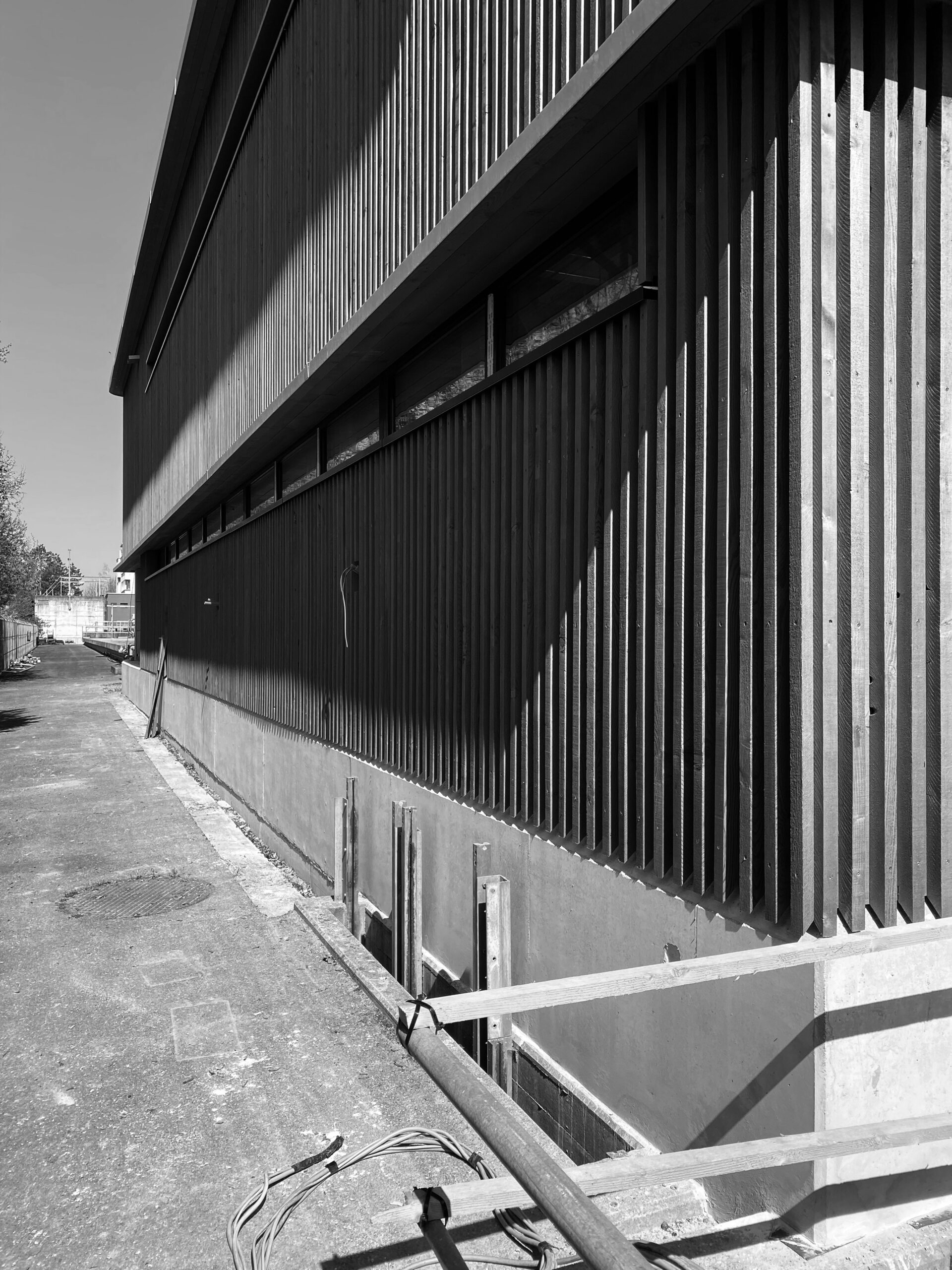Und für den Übergang von Holzfassade zu Betonsockel haben wir uns etwas Besonderes ausgedacht. Als wir diese Stelle mit dem Holzbauer besprochen haben, meinte dieser zum Gefälle der Krone des Betonsockels: «Je steiler, desto besser für das Holz.» Dies, weil weniger Schnee liegen bleibt und der Regen weniger stark an die Unterseite der Holzlatten spritzt.