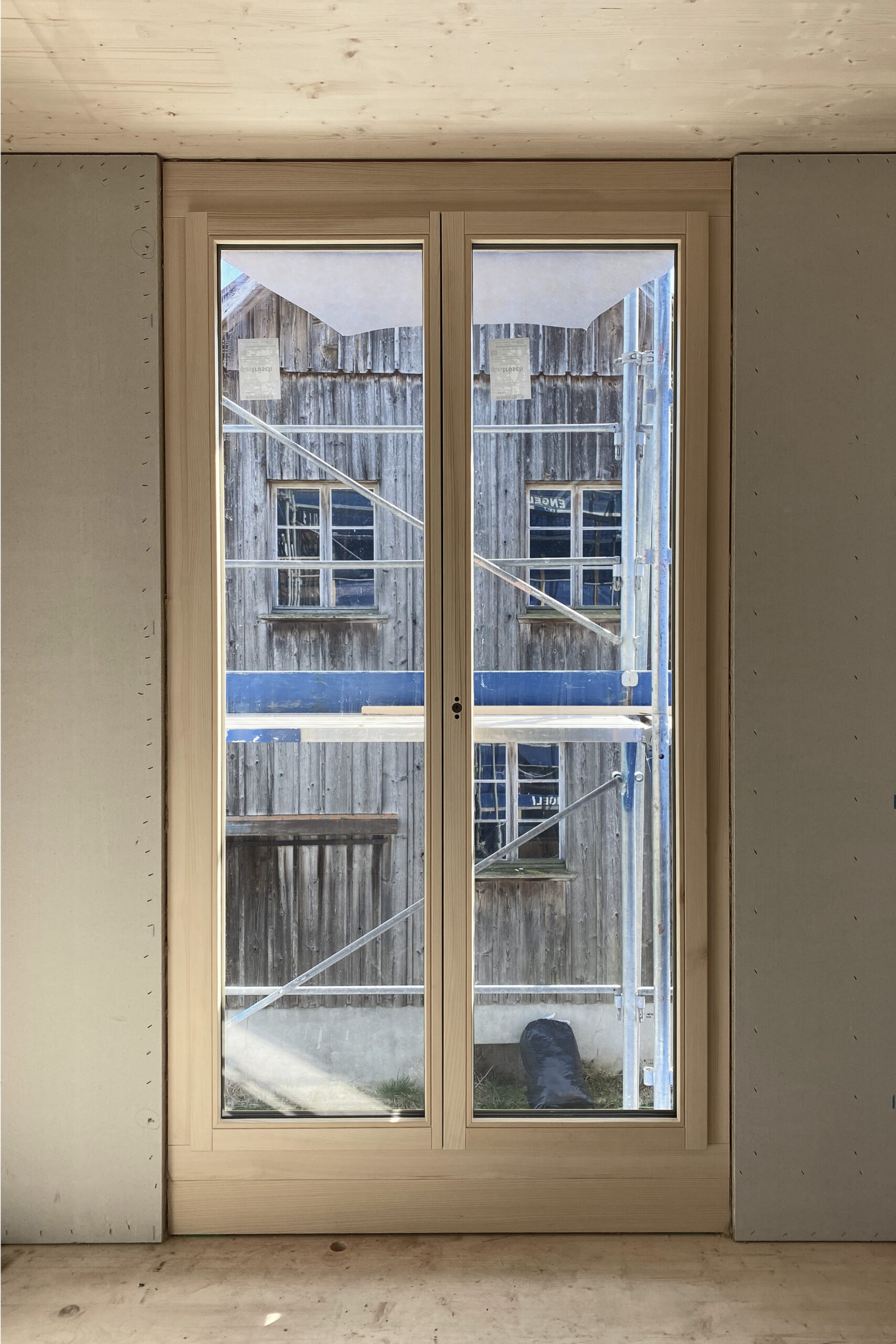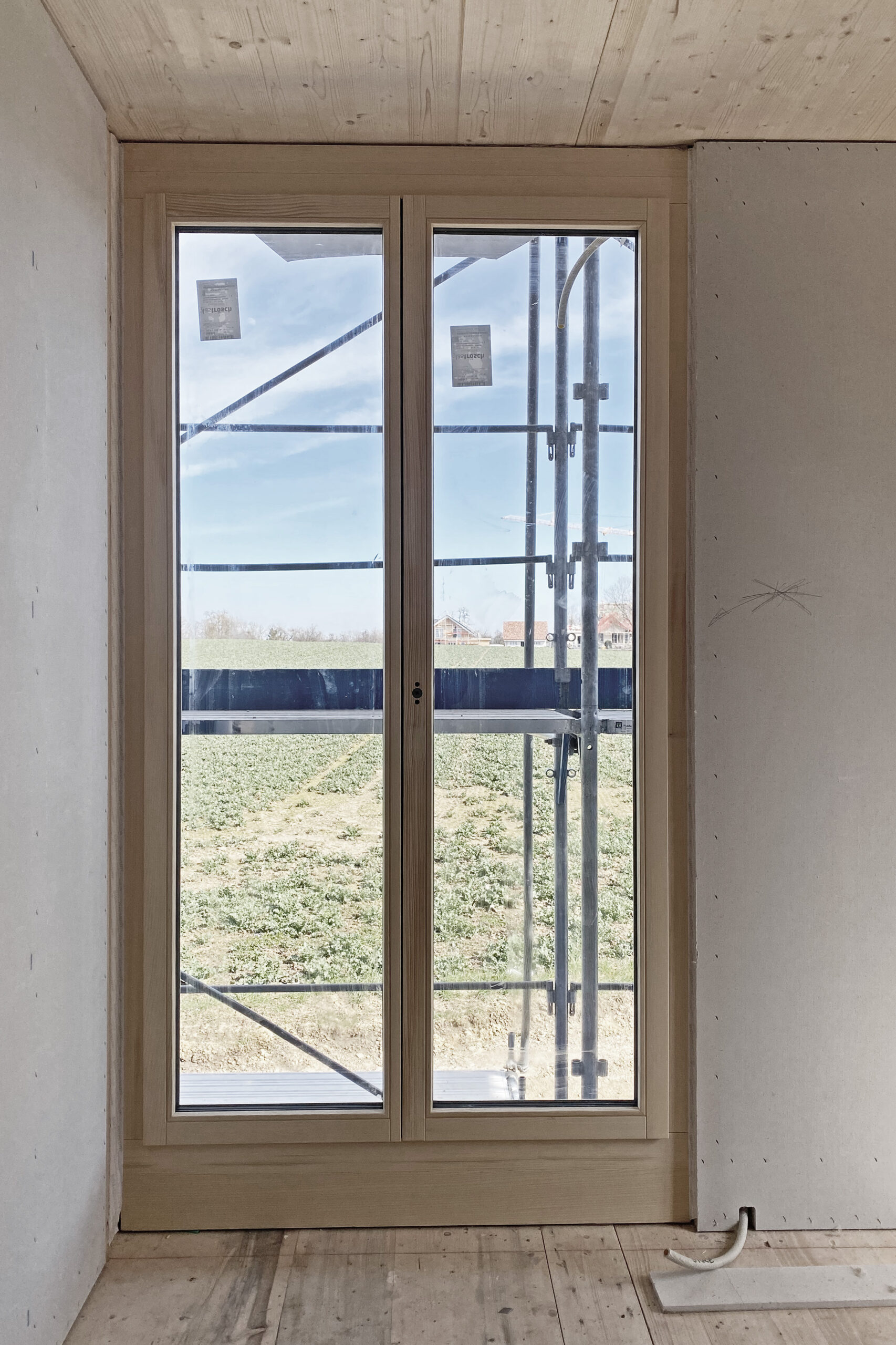Der Rohbau der ersten beiden Einheiten steht jetzt und macht grosse Freude – die Splitlevelorganisation erweist sich wie gewünscht als räumliche Wundertüte, die französischen Fenster als optimale Lösung für die Zimmer – und die Räume unter dem Dach als aussergewöhnliche Bäder. Und in jeder Wohnung erzeugt die Dualität der Lage – auf der Südseite die räumliche Nähe des Hofes, auf der Nordseite der weite Blick in die Kulturlandschaft – eine erstaunlich spannungsvolle Wahrnehmung des Ortes.