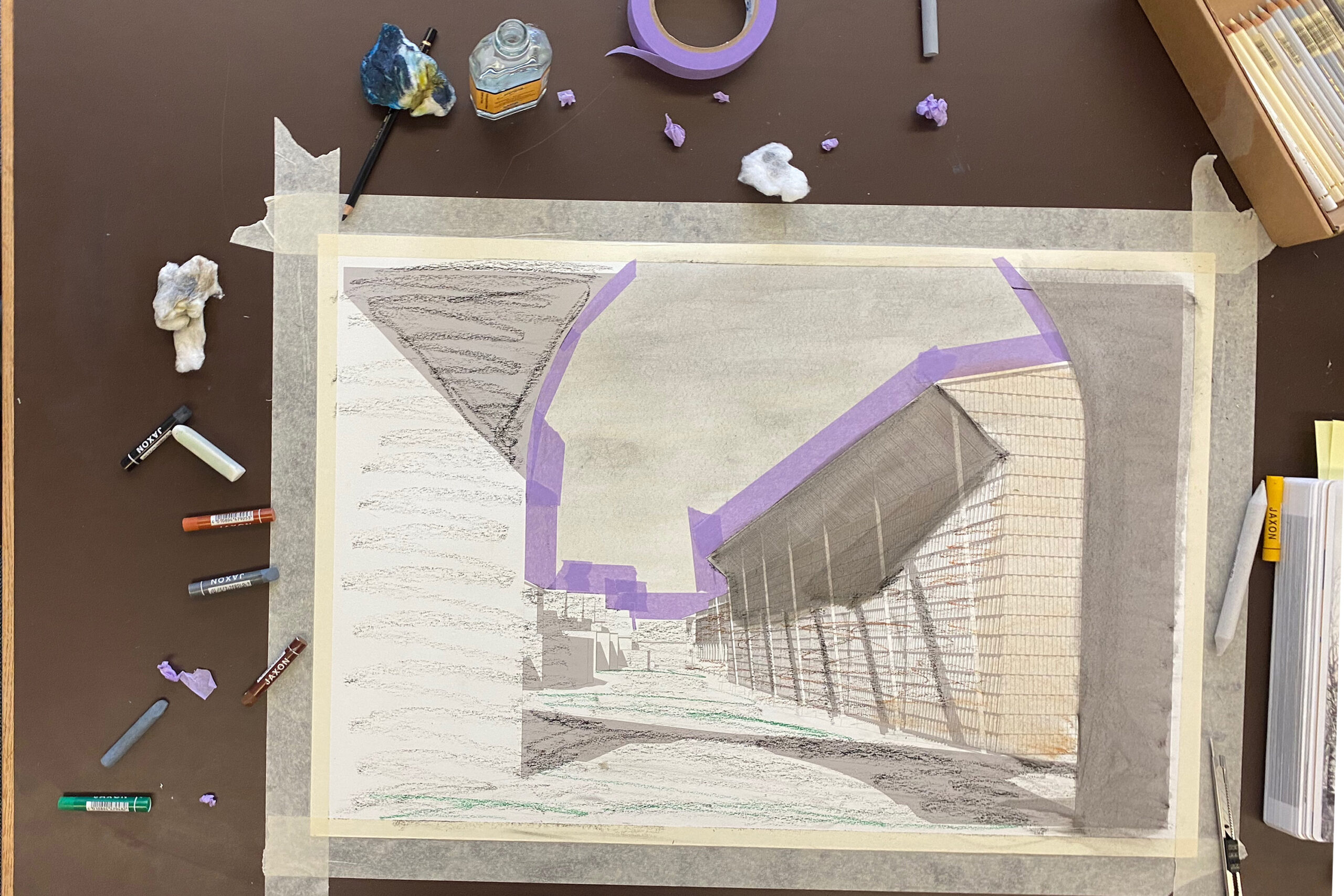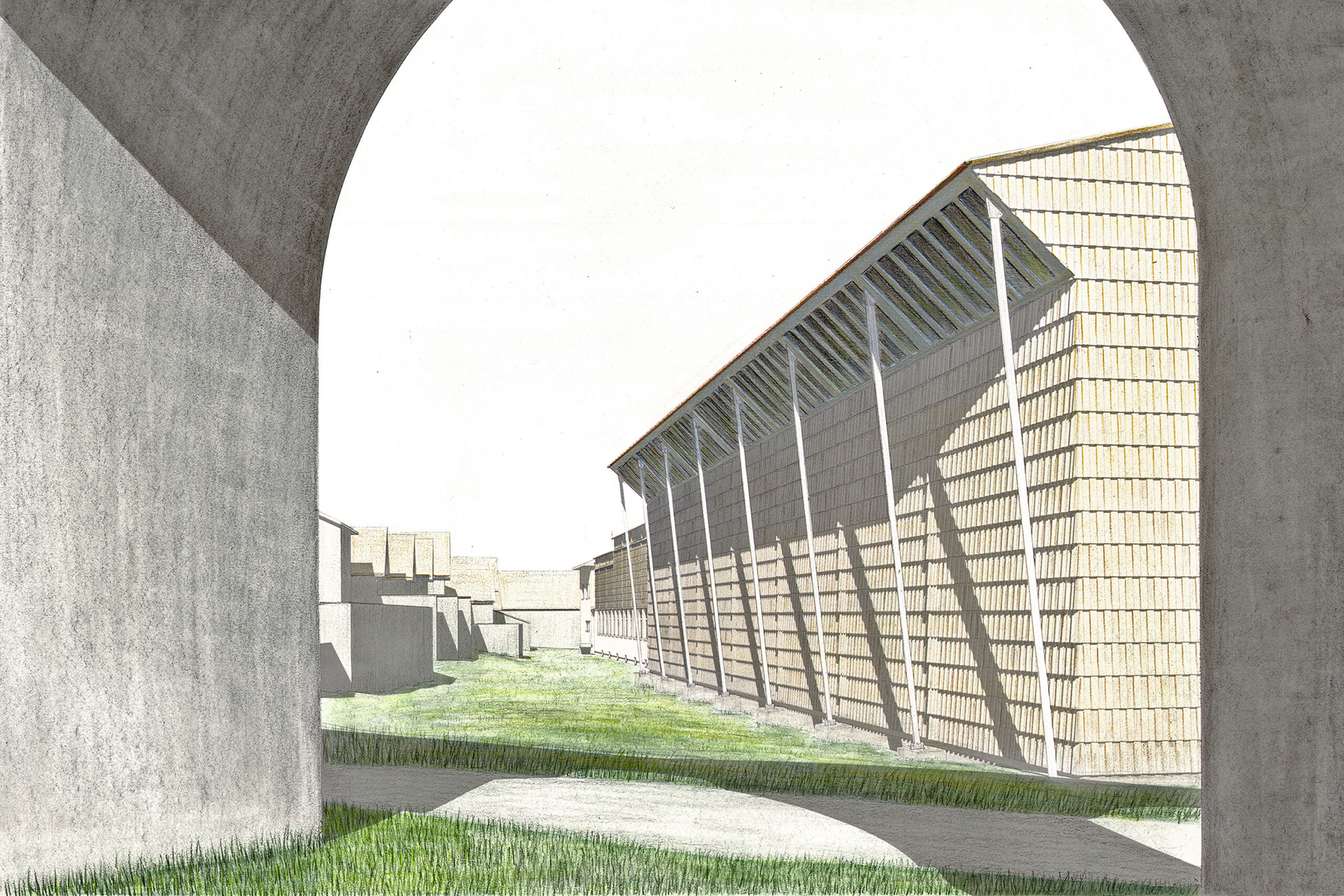 Anfangs Dezember letzten Jahres ergab es sich, dass zwei Wettbewerbsabgaben zur gleichen Zeit stattfinden sollten: Die Erweiterung der Produktionsstätte der Appenzeller Alpenbitter in Appenzell und die Neugestaltung des Obstmarktes in Herisau. Wir nutzten die Gelegenheit, um ein lange geplantes und immer wieder verschobenes Projekt in Angriff zu nehmen: Visualisierungen in jener Jaxonkreidetechnik zu erstellen, welche die Analogen um Miroslav Sik am Lehrstuhl von Fabio Reinhart in den 1980er Jahren an der ETH entwickelt und benutzt hatten. Nicht ohne Mühe und nur dank der Hilfe von Christoph Mathys gelang es uns schliesslich, an einem langen Wochenende vier Visualisierungen fertigzustellen.