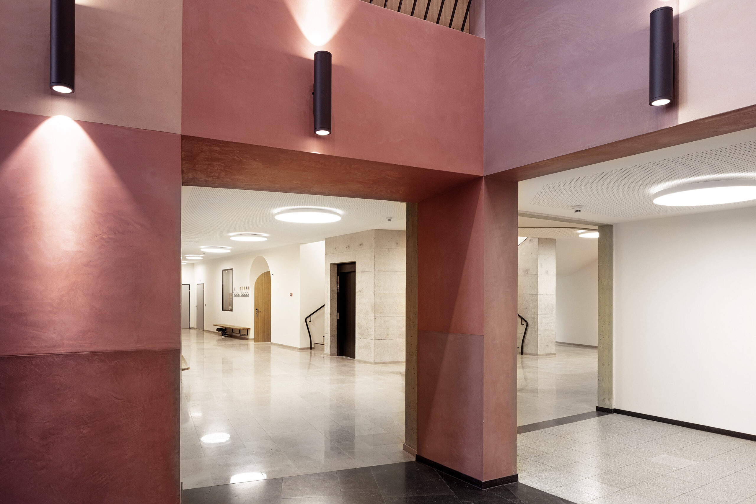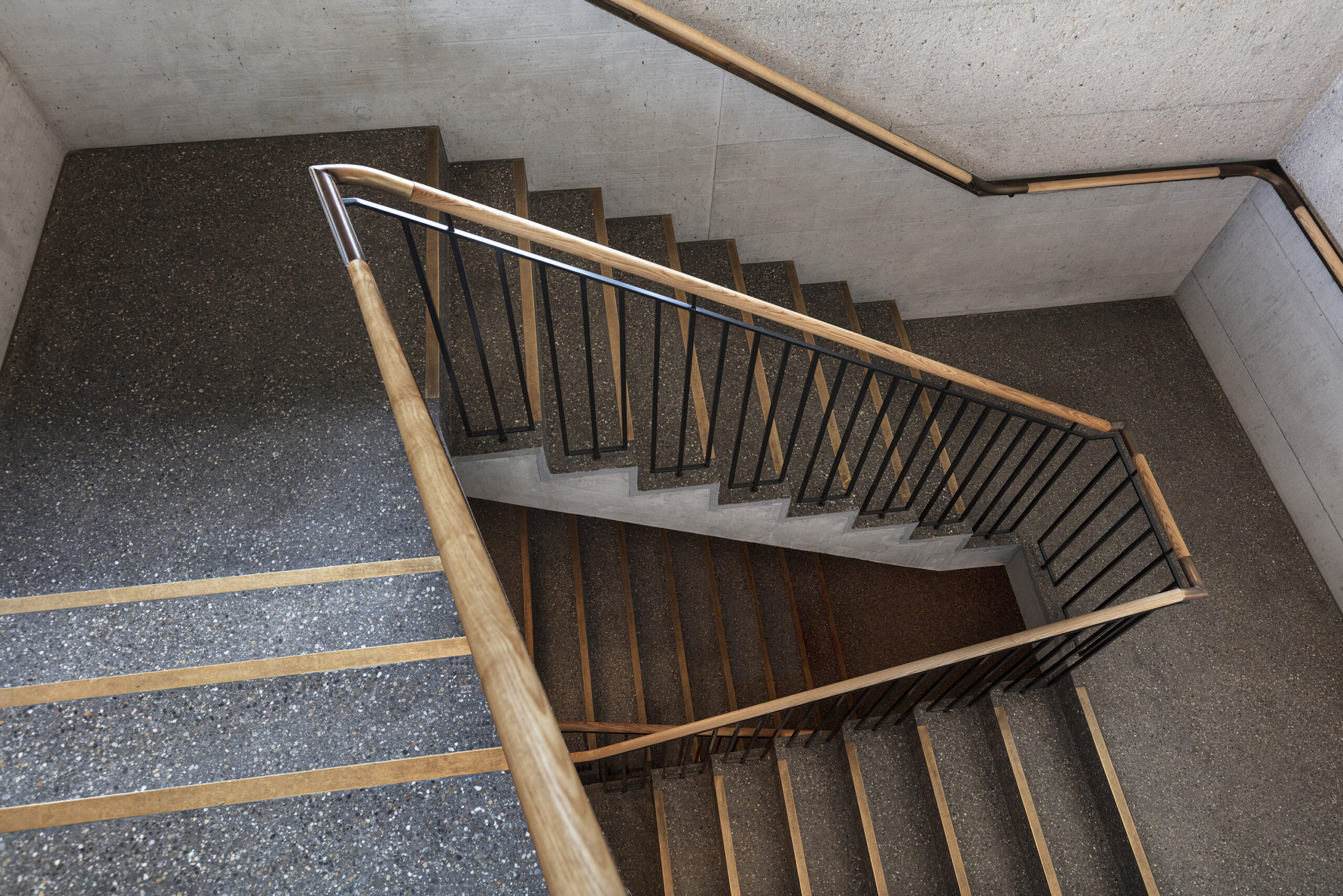Es sind neue Bilder von Lucas Peters vom Ekkharthof eingetroffen – und machen uns so viel Freude, dass wir sie hier kurz erwähnen möchten. Vor allem jene vom Gemeinschaftsgebäude zeigen neue Aspekte, da beim ersten Phototermin die Umgebung, das Heizungshaus und der Ekkharthofplatz noch nicht vollendet waren. Auch diverse bislang nicht gezeigte Details vom Schulhaus erinnern mich wieder an die Leidenschaft und Sorgfalt, mit der unser Team (Projektleiter Carlos Wilkening, Carmen Diaz, Caroline Schillinger) die Ausführung geplant hat, an die Geduld und Beharrlichkeit des Baumanagements (Heide Carrilho und Philipp Klay der Forster Burgmer AG) sowie natürlich an die unglaublich guten Handwerksbetriebe, welche die Herausforderungen dieser Bauten gemeistert haben. Man beachte etwa die Stufenmarkierungen aus Blaustein sowie die daran angepasste, zweifarbige Kittfuge im Treppenhaus des Schulhauses..