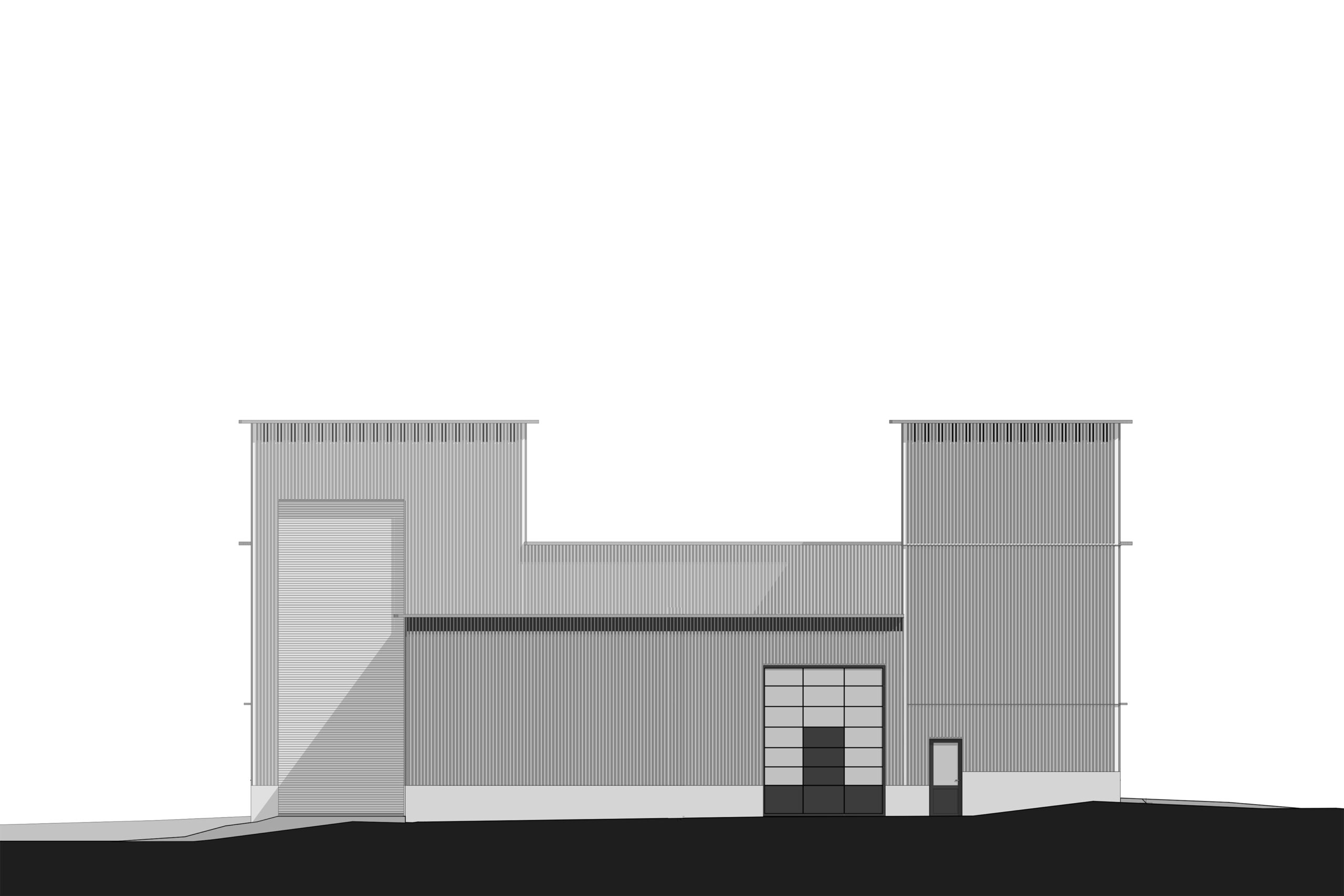 im Vordergrund die umgebaute, bestehende Anlieferung, rechts das neue Lagergebäude