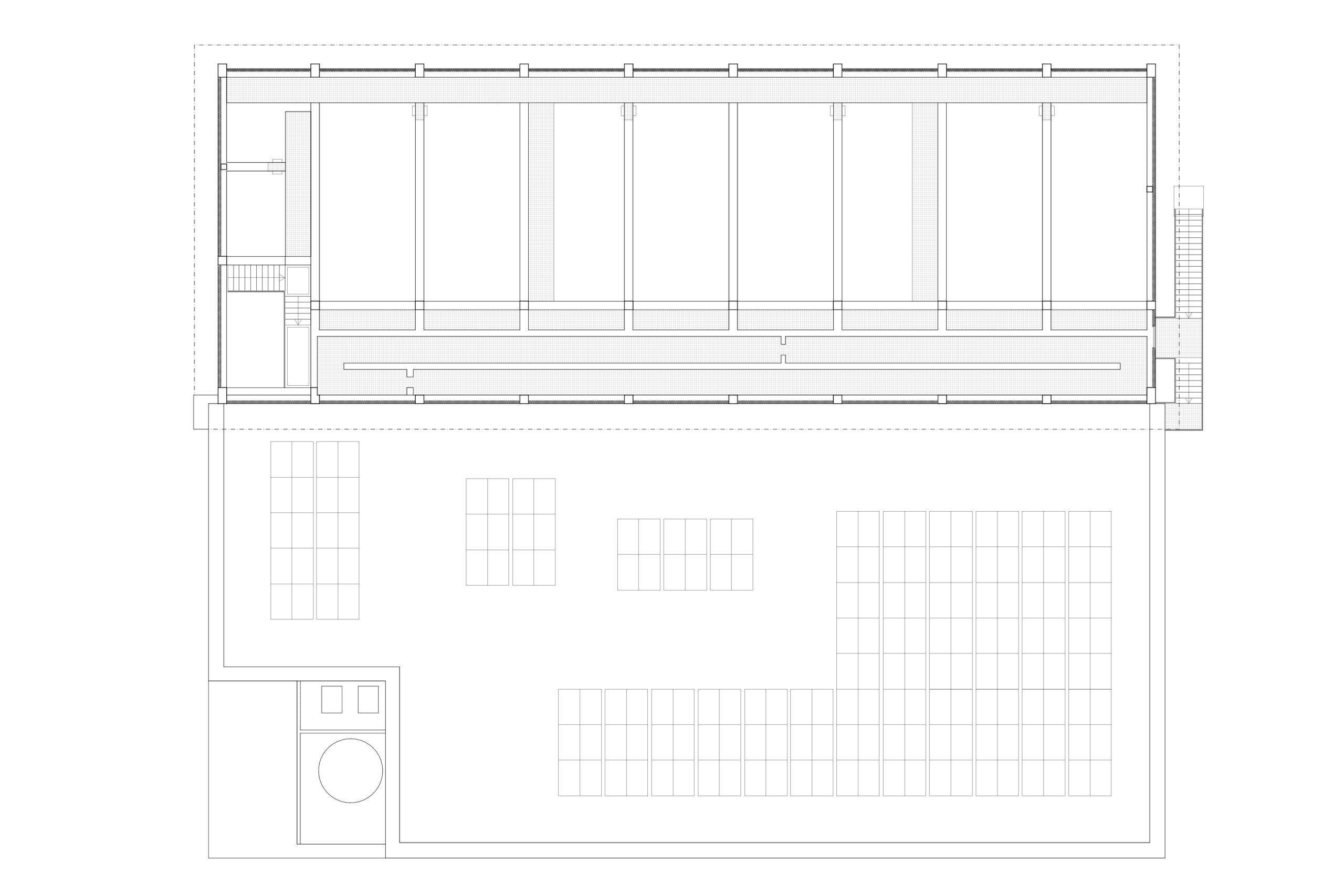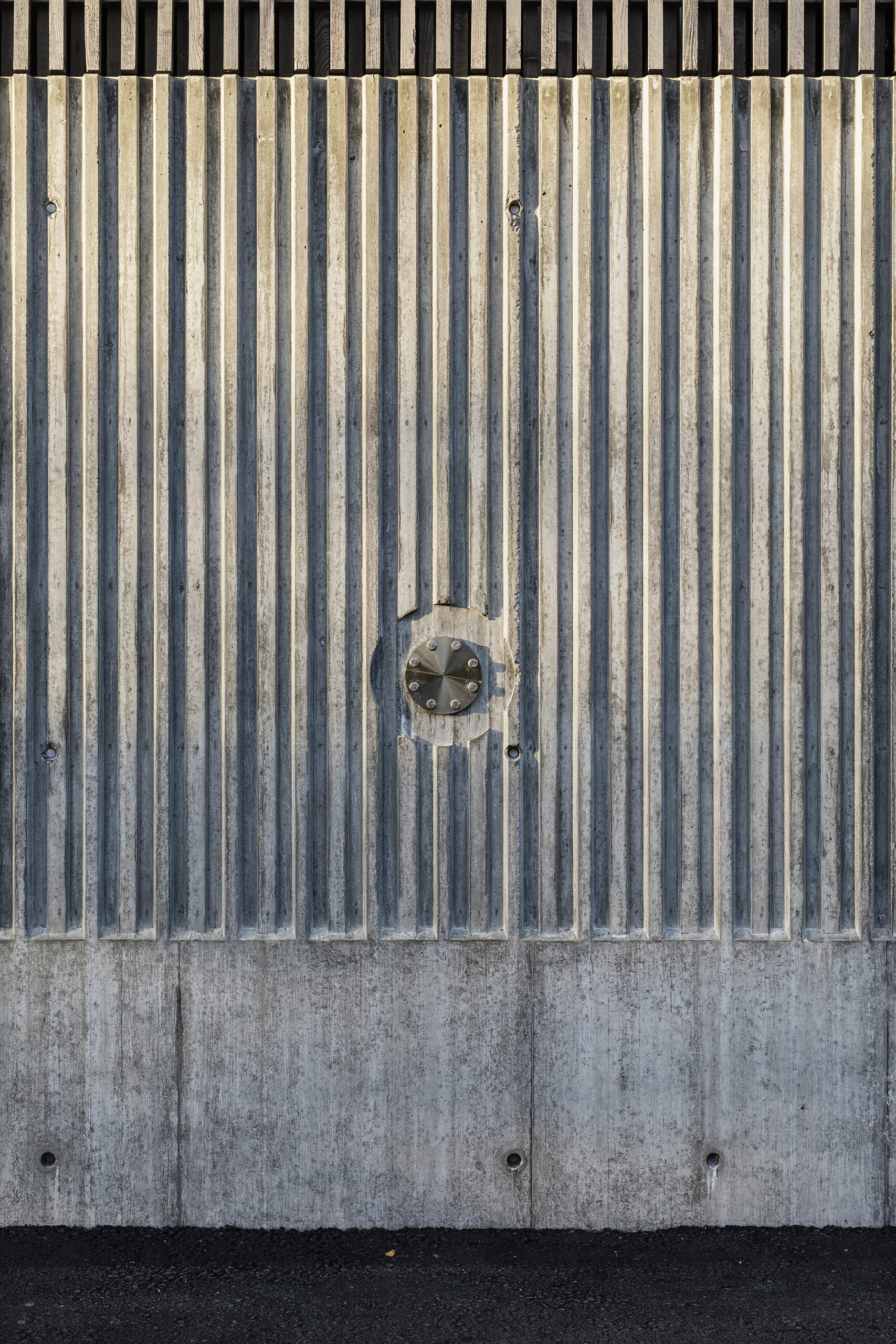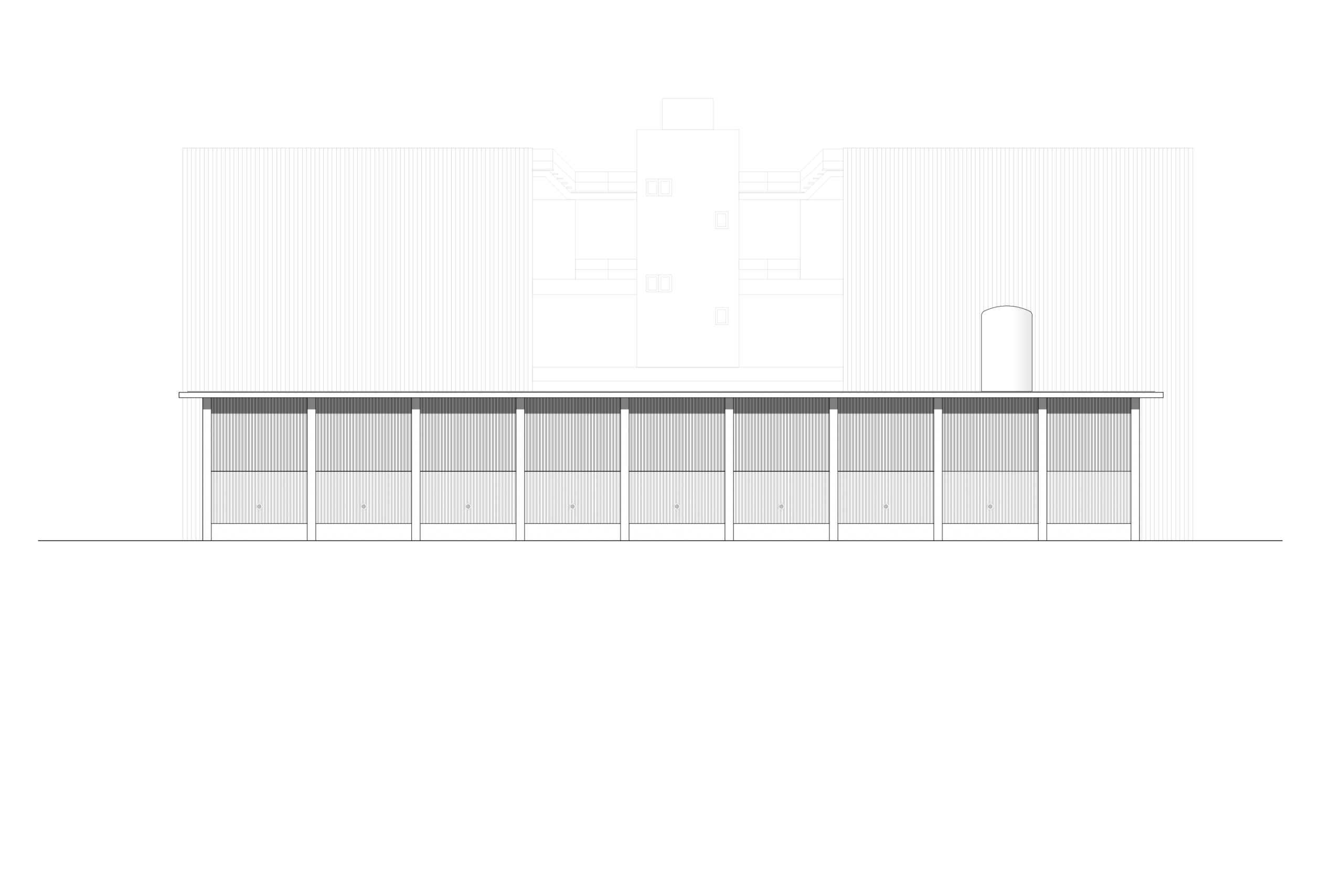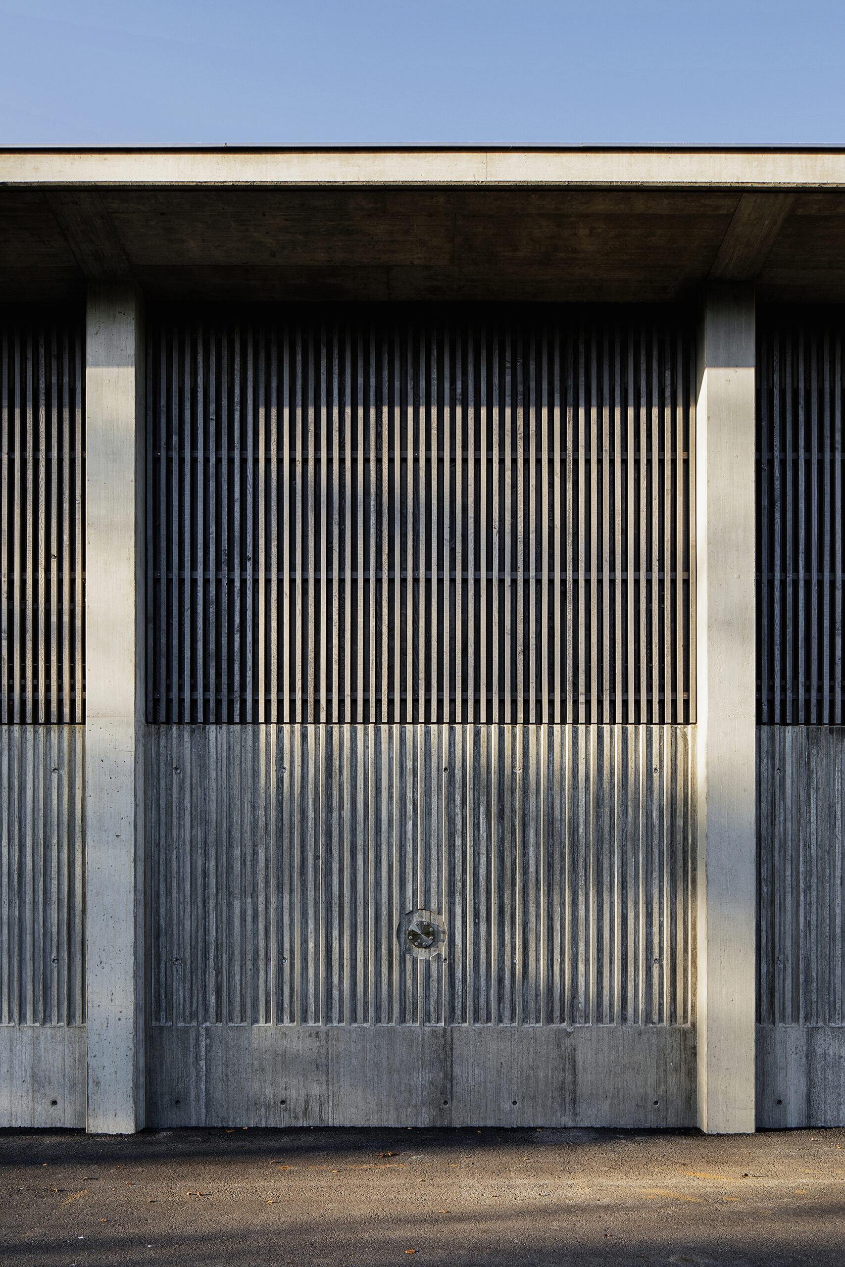 Die gleiche Fassade, jedoch in einer geschlossenen Ausführung und geschützt von einem Vordach aus Beton, zieht sich auch um den niedrigen Teil des Gebäudes. Durch ihre offene Struktur erlaubt sie es, die technisch notwendigen Lüftungsein- und auslässe kaum sichtbar zu integrieren.