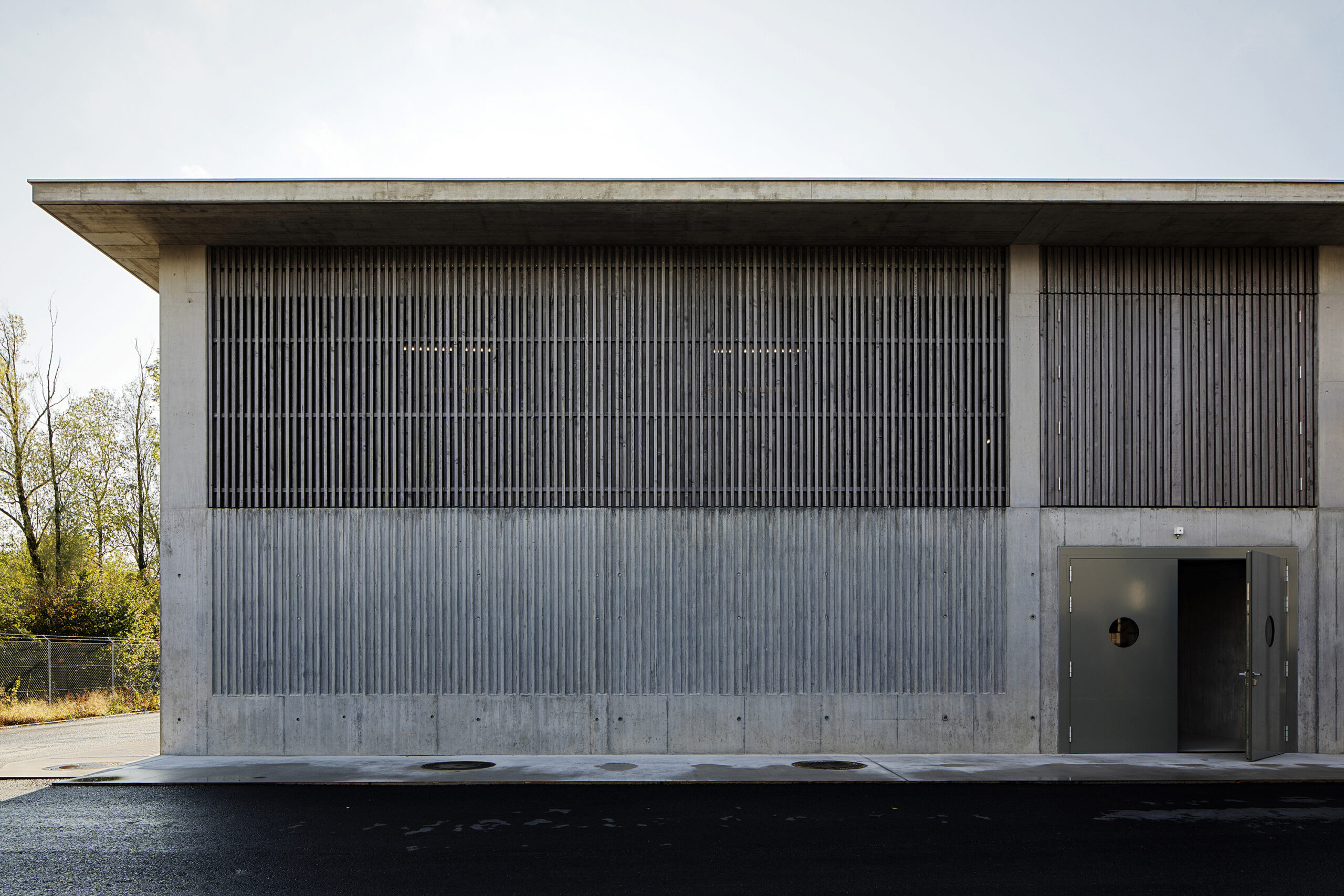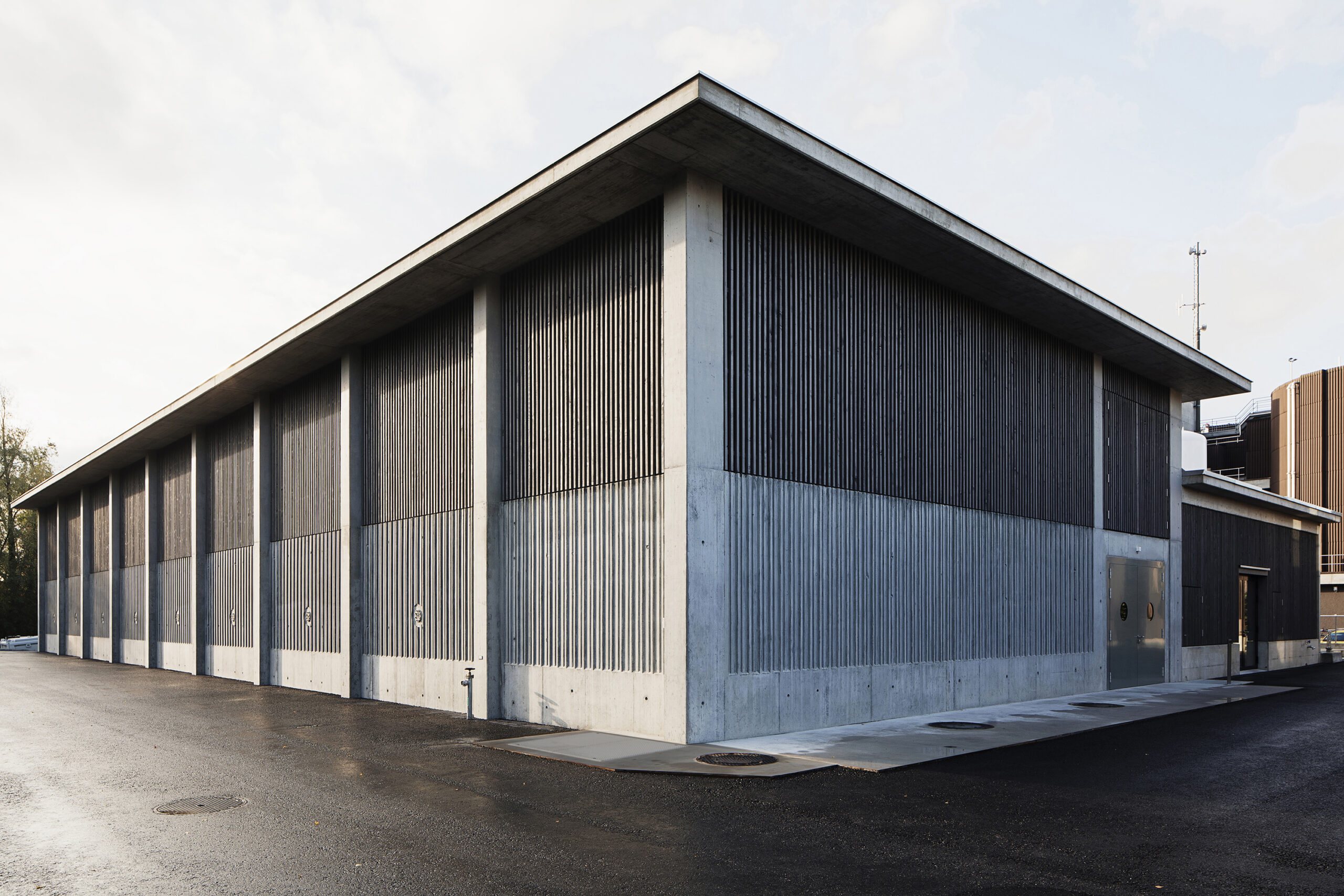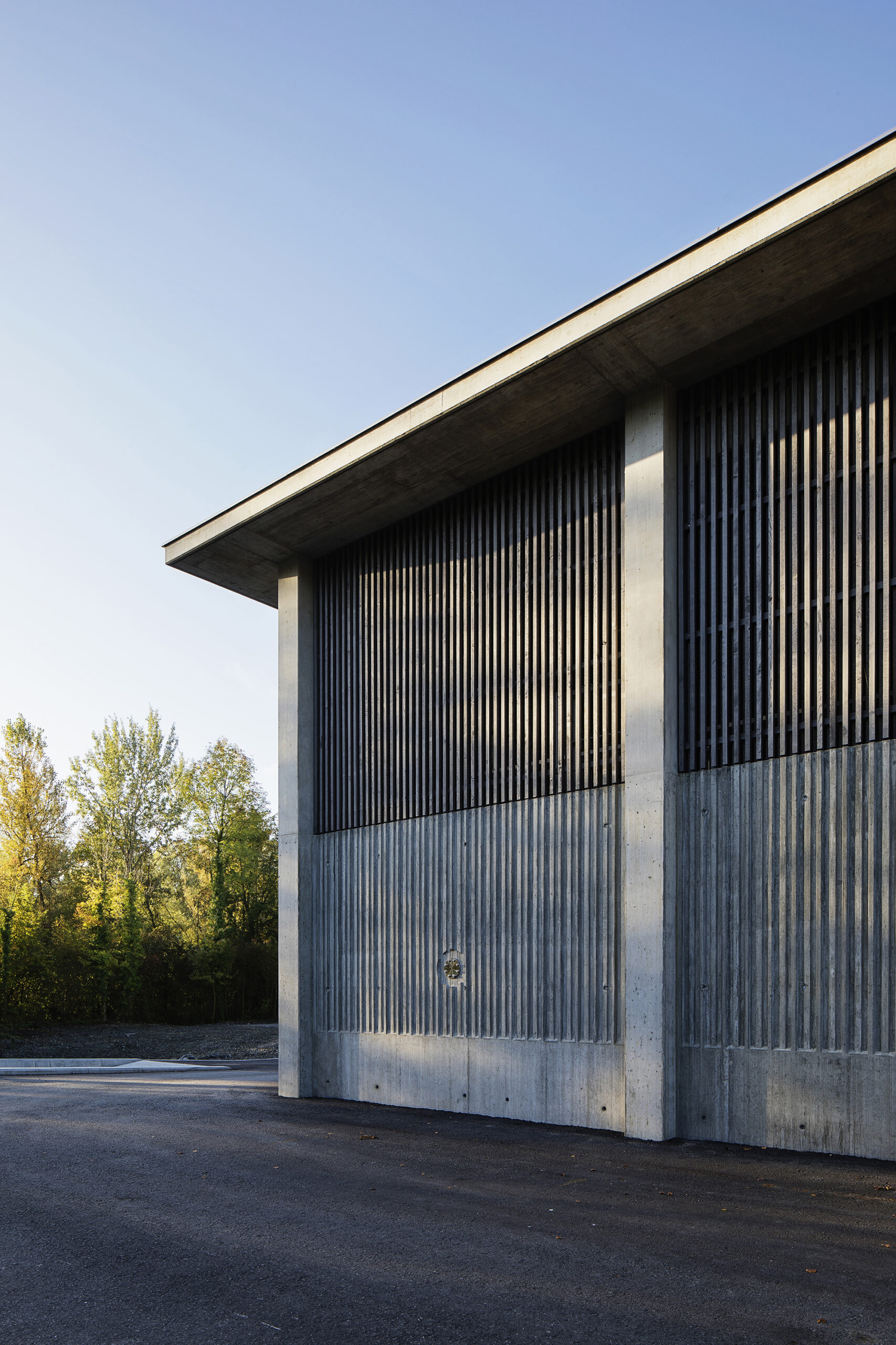 Die Gebäudehülle der neuen EMV-Anlage entwickelt sich sehr direkt aus den technischen Bedingungen des Baus. Die Zwischenwände der Klärbecken wurden zu Pilastern erweitert, die das Dach tragen. Im unteren Teil zeigt die Fassade direkt die Betonwannen der Klärbecken, die mit einer vom Zimmermann erstellten Schalungseinlage als Fassade gestaltet wurden. Darüber, als natürliche Belüftung, wurde eine raumhohe «Filterzone» gebaut – so konnte auf eine künstliche Belüftung verzichtet werden. Die «Lüftungsgitter» bestehen aus versetzt angeordneten Holzlatten. Ein weites Vordach schützt das Holz und die dahinter liegenden Klärbecken.
