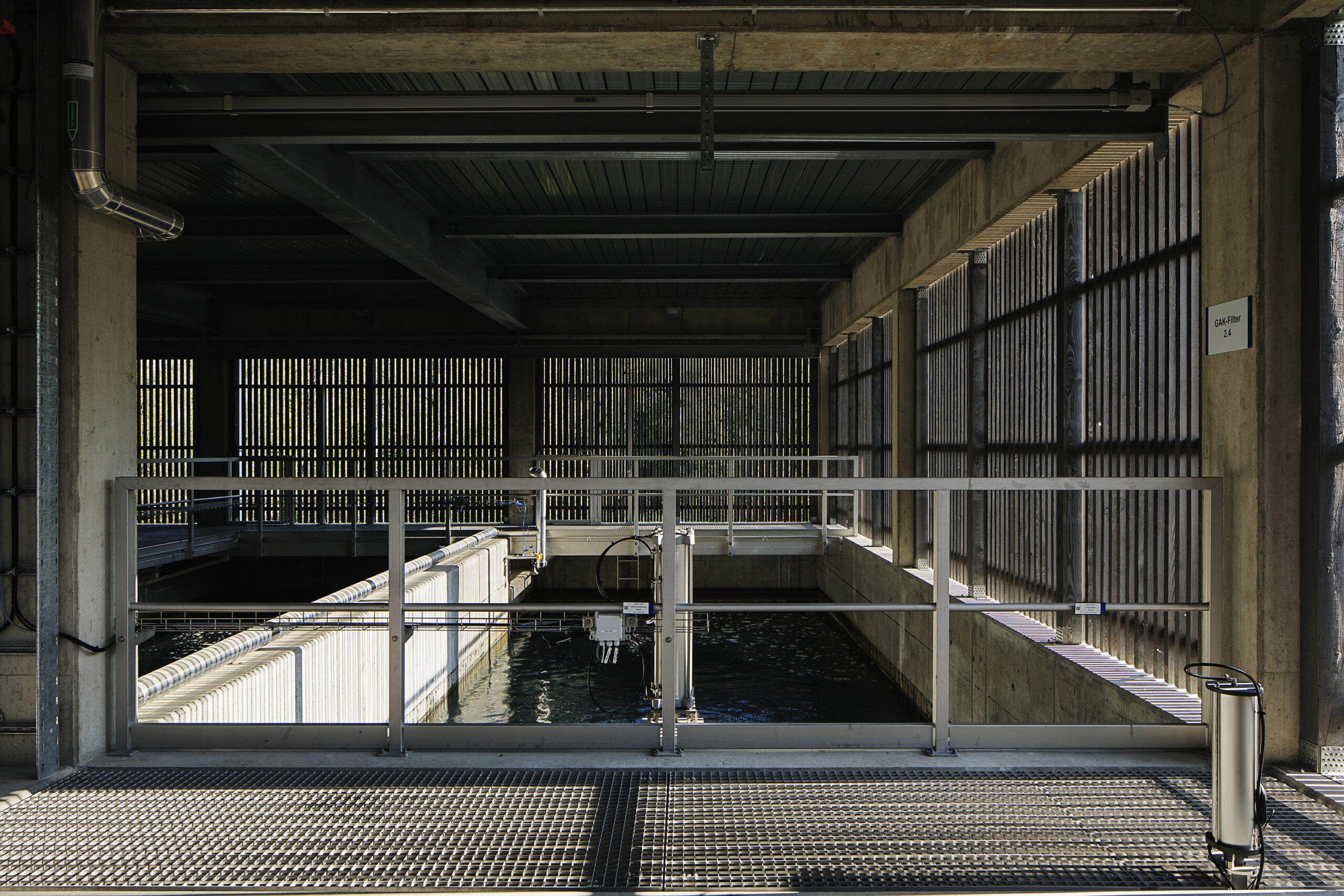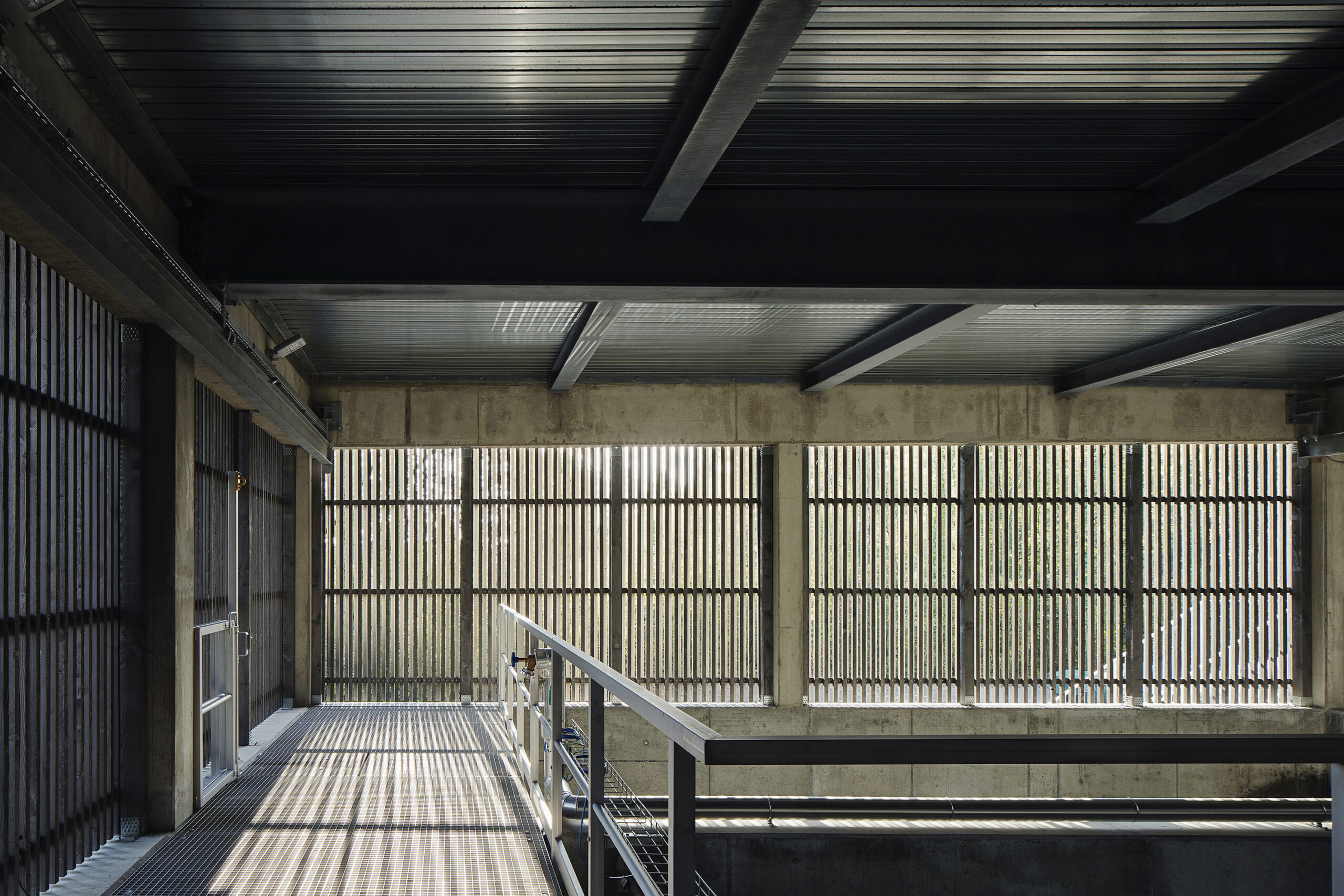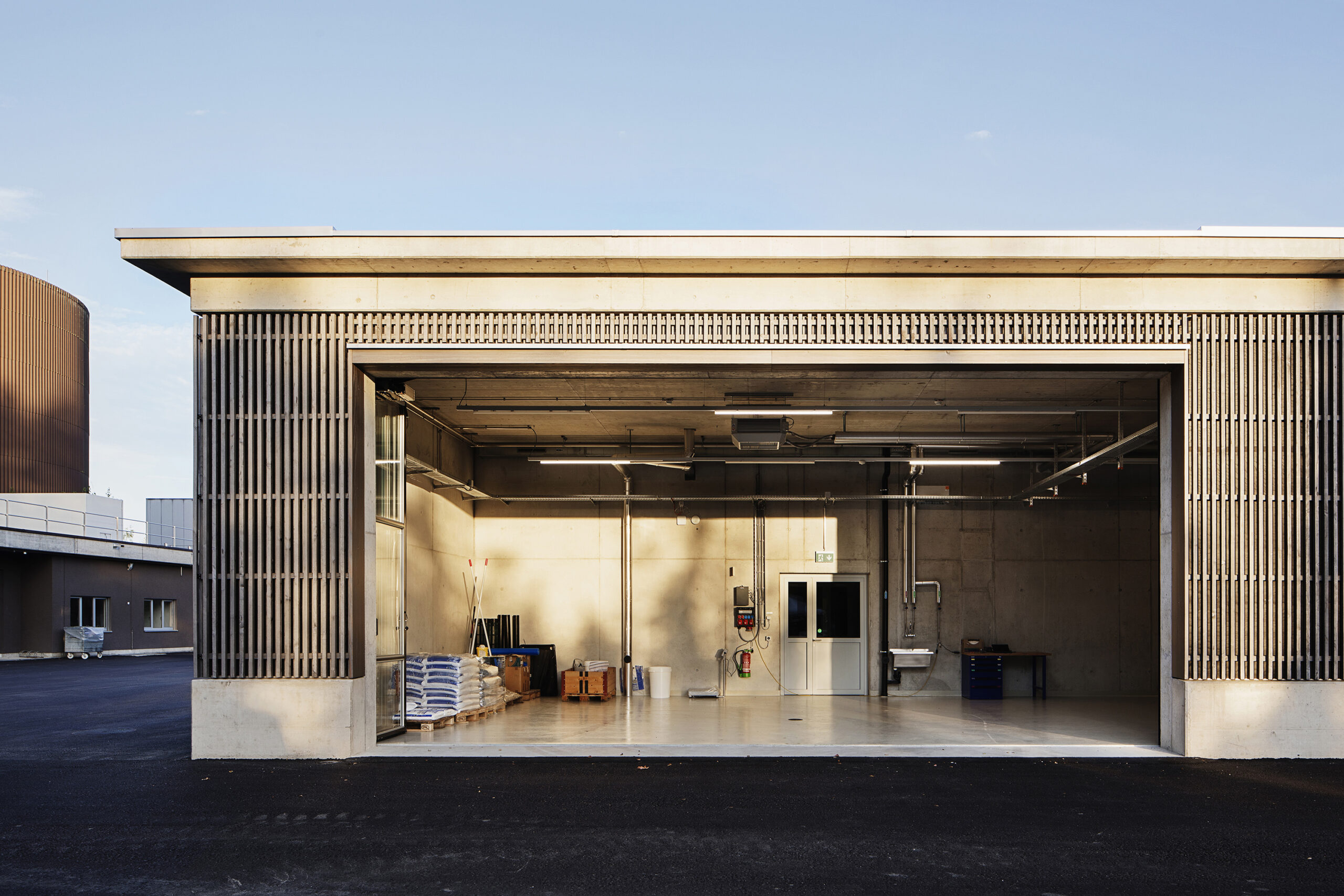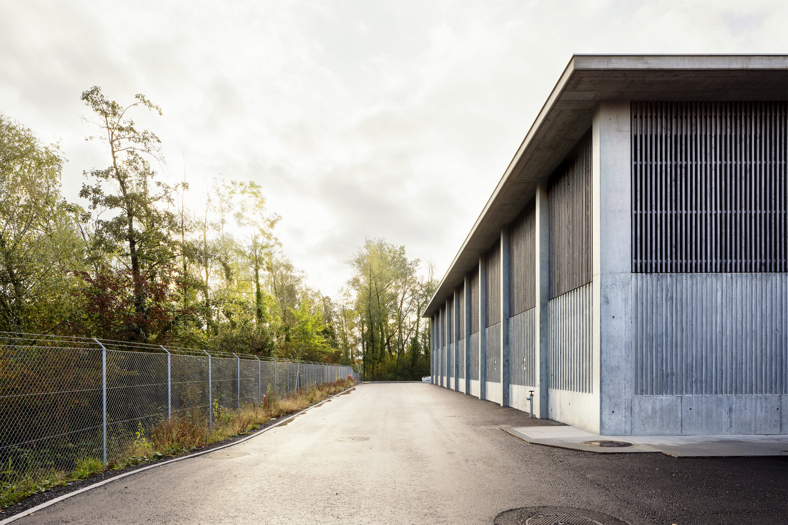 Die Gebäudehülle der neuen EMV-Anlage entwickelt sich sehr direkt aus den technischen Bedingungen des Baus. Die Zwischenwände der Klärbecken wurden zu Pilastern erweitert, die das Dach tragen. Im unteren Teil zeigt die Fassade direkt die Betonwannen der Klärbecken, die mit einer vom Zimmermann erstellten Schalungseinlage als Fassade gestaltet wurden. Darüber, als natürliche Belüftung, wurde eine raumhohe «Filterzone» gebaut – so konnte auf eine künstliche Belüftung verzichtet werden. Die «Lüftungsgitter» bestehen aus versetzt angeordneten Holzlatten. Ein weites Vordach schützt das Holz und die dahinter liegenden Klärbecken.