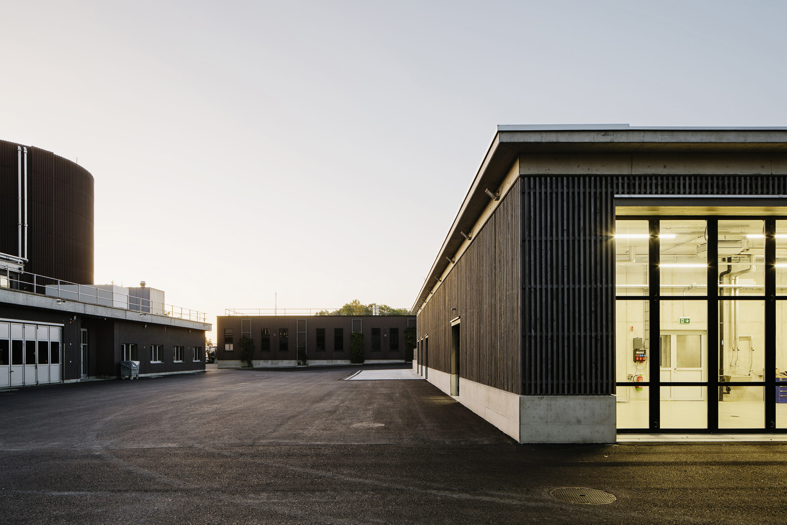 Mit dieser Strategie soll auch in Zukunft auf der Anlage gearbeitet werden. Es werden nach Möglichkeit immer wieder ähnliche Elemente eingesetzt: dunkel gestrichene Putze, Sichtbeton und vertikal gegliederte Holzfassaden in vorvergrautem Tannenholz. Zum Schutz dieser Holzfassaden werden Vordächer aus Beton eingesetzt. Auch dieses Element wird immer wieder eingesetzt – etwa bei der EMV-Anlage oder bei den Stapel- Mischbehältern und trägt so zum einheitlichen Erscheinungsbild der gesamten Anlage bei.