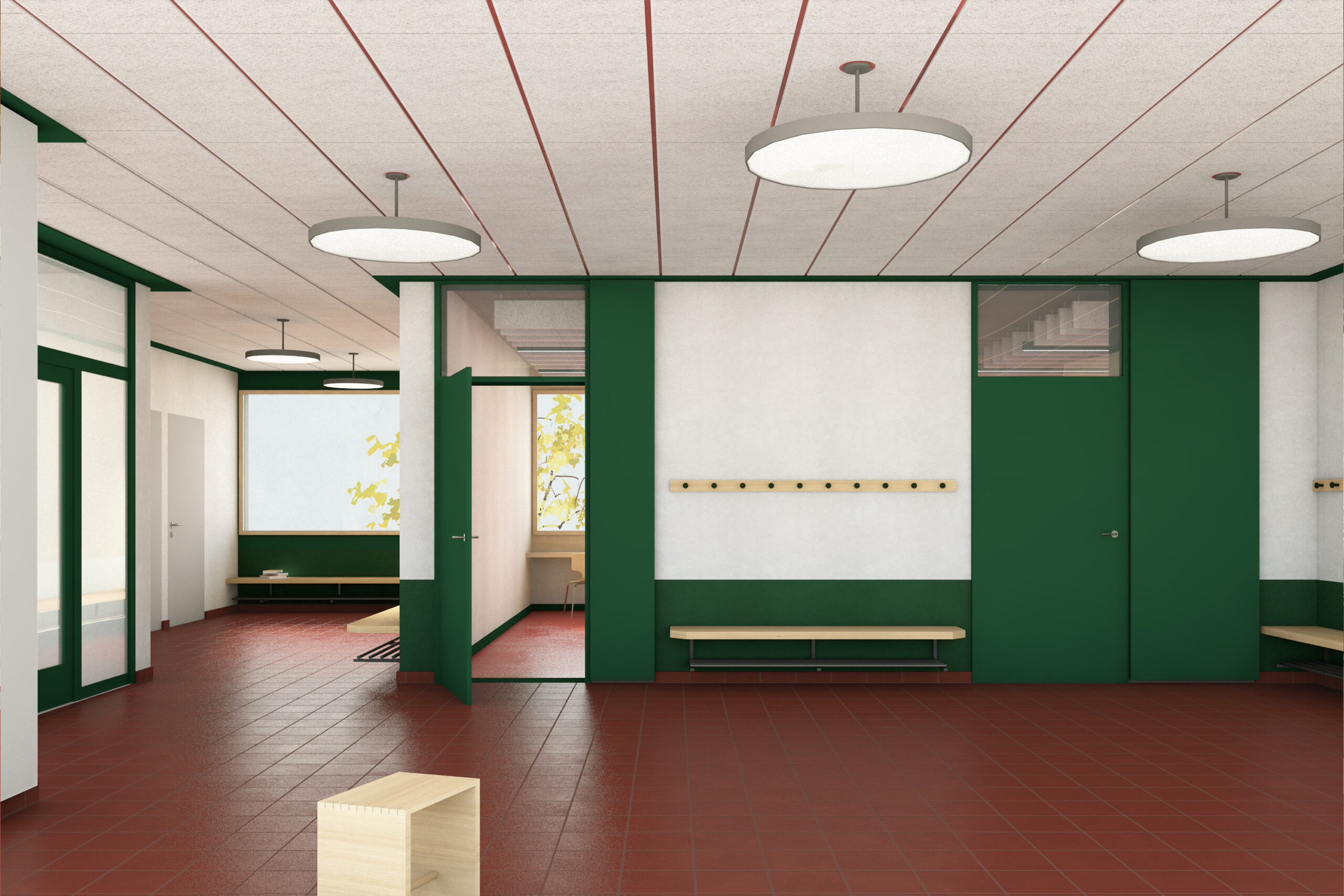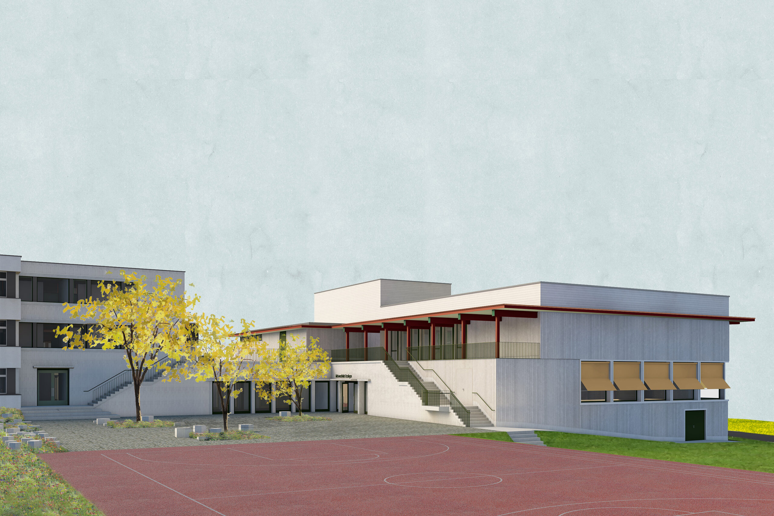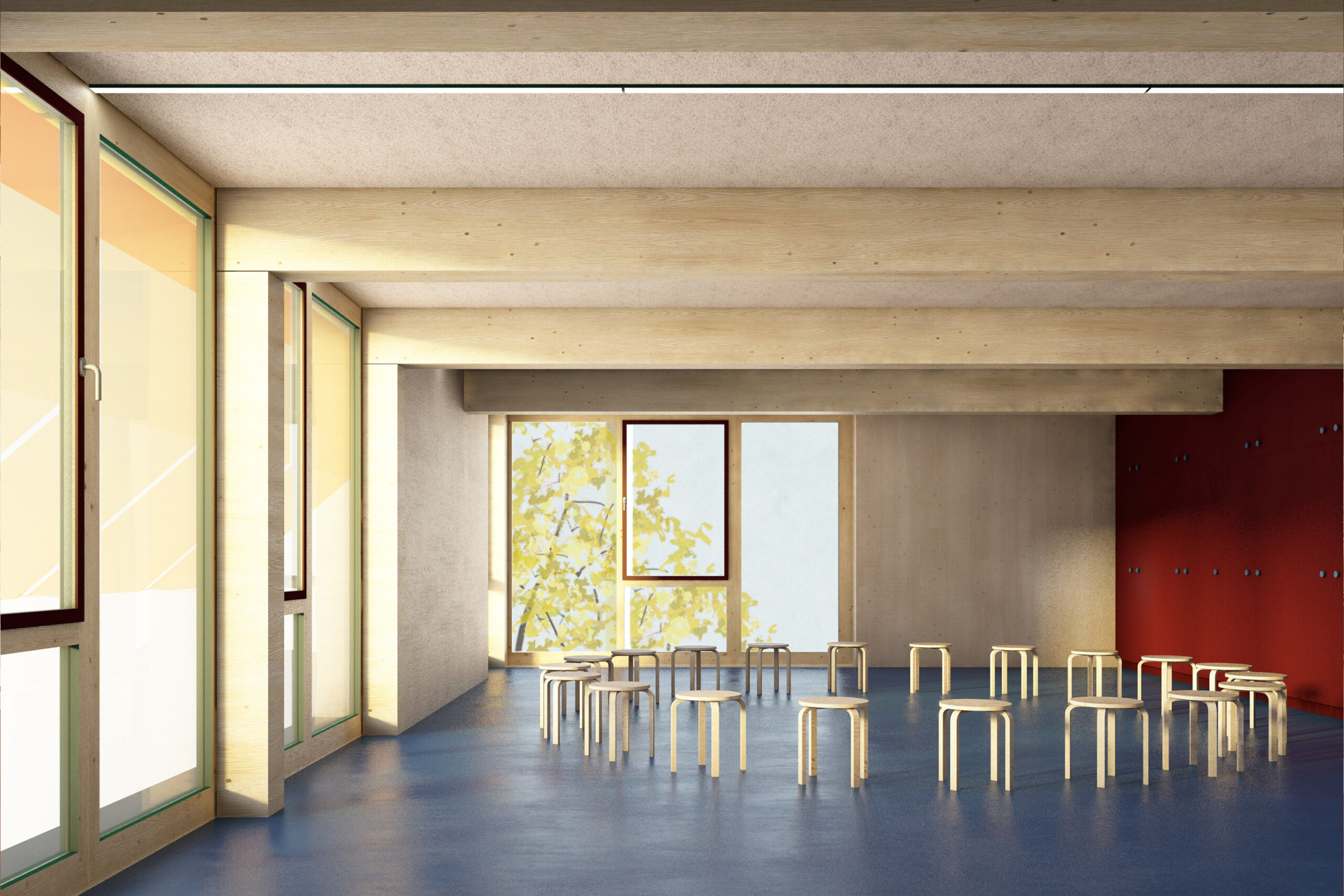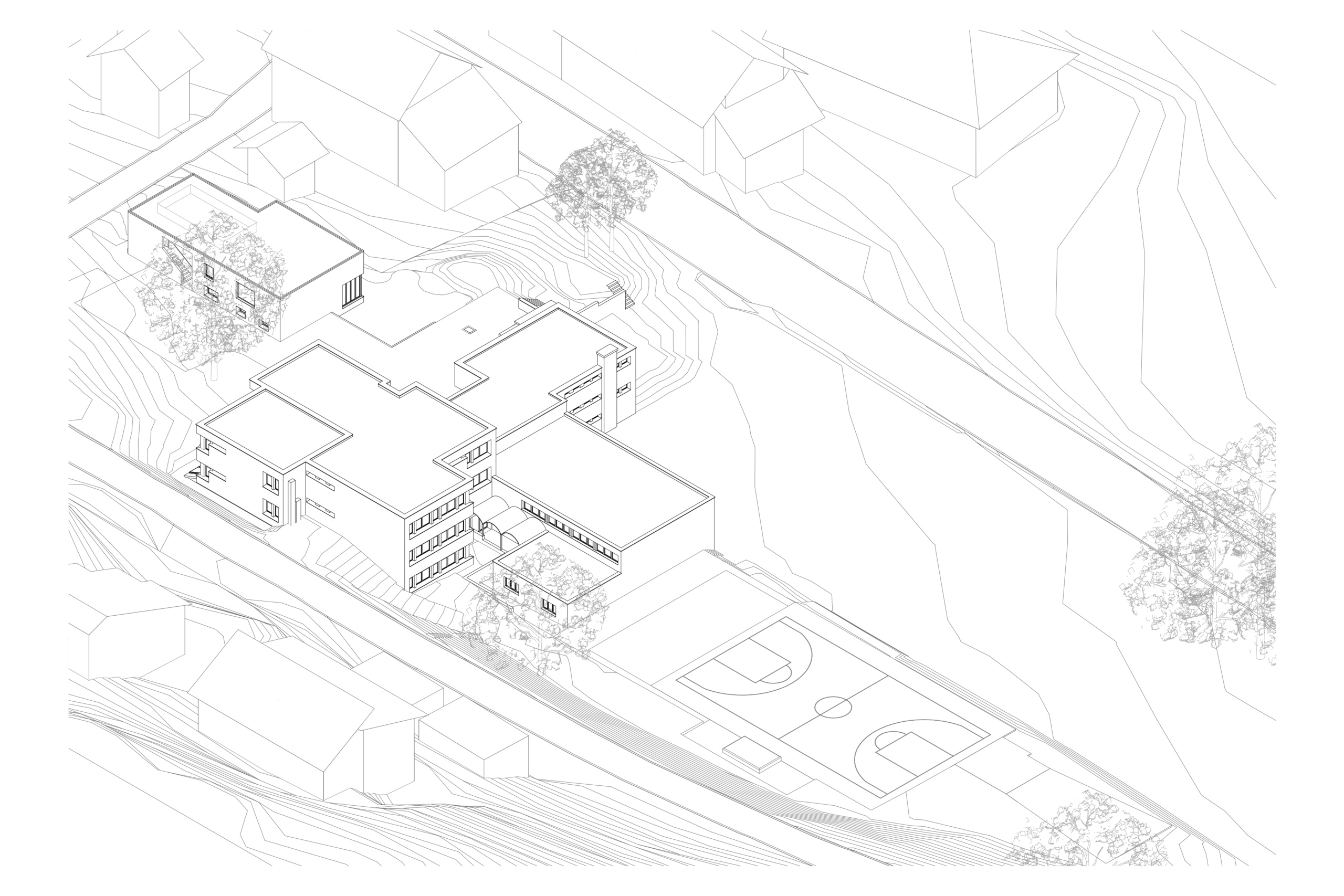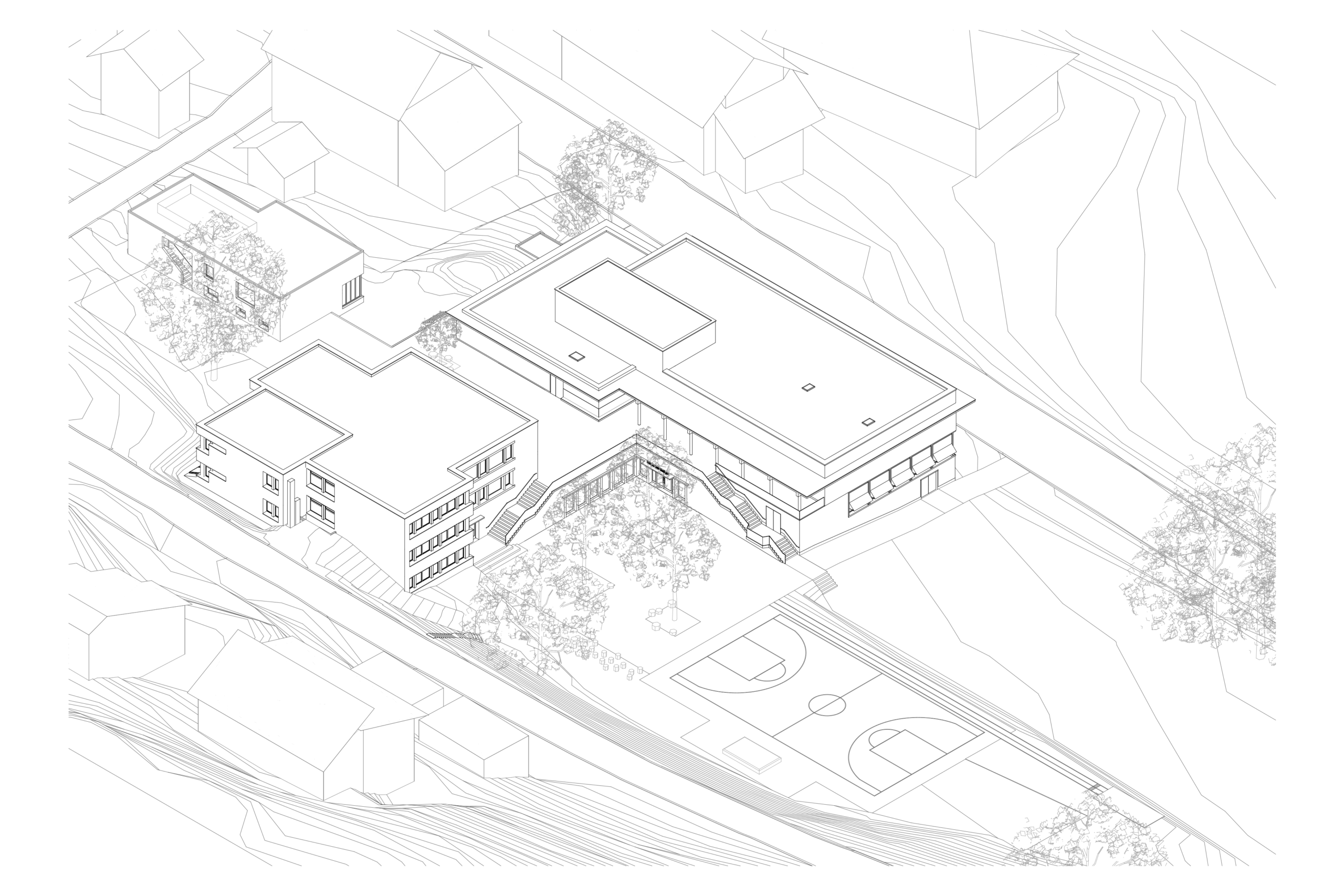 Wir haben uns bemüht, die Eingriffe so klein wie möglich zu halten, die Erweiterung knapp und integrativ und die ganze Anlage auf eine möglichst zurückhaltende, fast leise Art in ein zukunftsfähiges Ensemble umzuwandeln. Das bestehende Schulhaus, obschon zum Abbruch freigegeben, lassen wir stehen – und versuchen, mit einigen kleinen Eingriffen und einer kleinen Erweiterung die ursprünglichen Qualitäten des Baus wiederzufinden und in zeitgemässe Schulräume zu übersetzen. Selbstverständlich lassen wir auch den bestehenden Kindergarten stehen. Er funktioniert gut und hat das Ende seiner Lebensdauer längst nicht erreicht. Statt einem Abbruch versuchen wir, seine etwas unglückliche, städtebauliche Setzung in das neue Ensemble einzubinden. Die Erweiterung der Anlage mit einer Mehrzweckhalle, einem Kindergarten und Räumen für die Lehrpersonen erfolgt in einer Holzbauweise, die ihren Ausdruck zwischen der Sprache des Holzbaus, der Geschichte des Ortes und dem erhaltenen Schulgebäude findet.