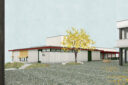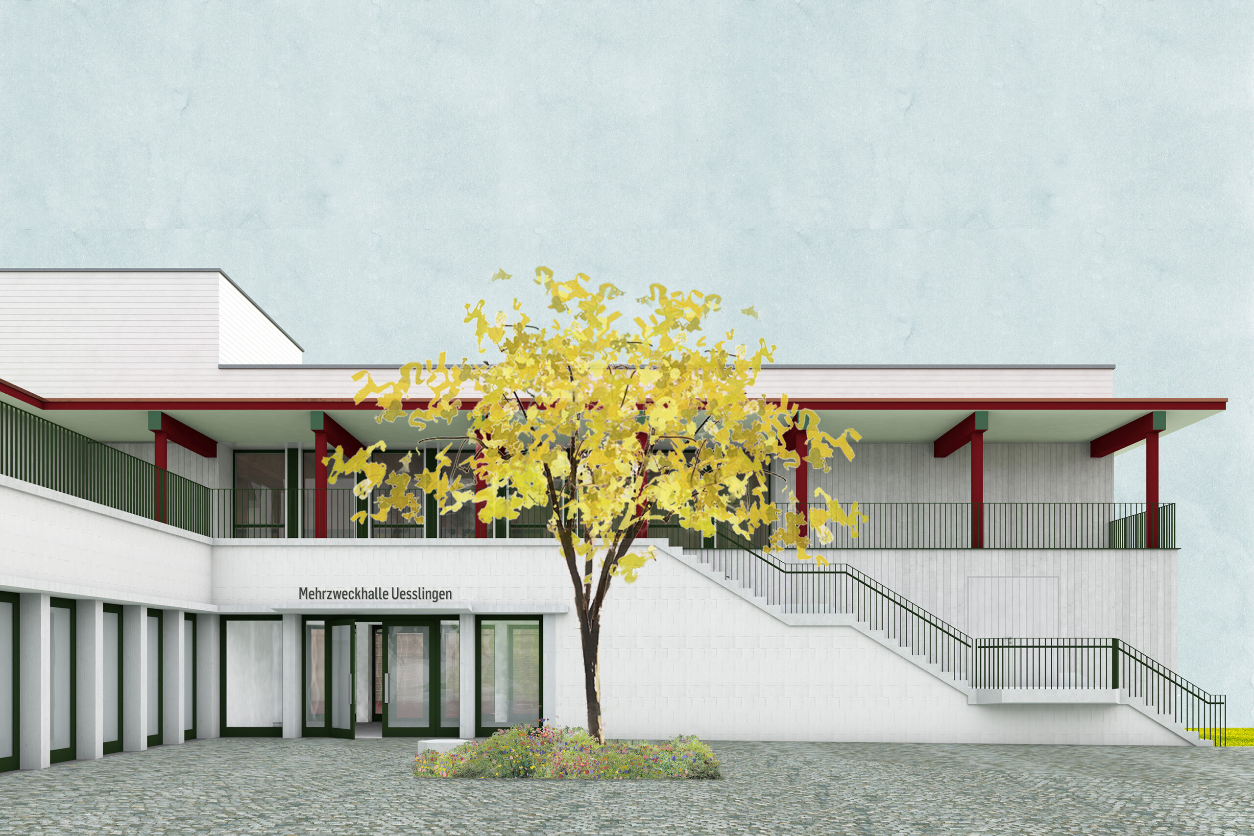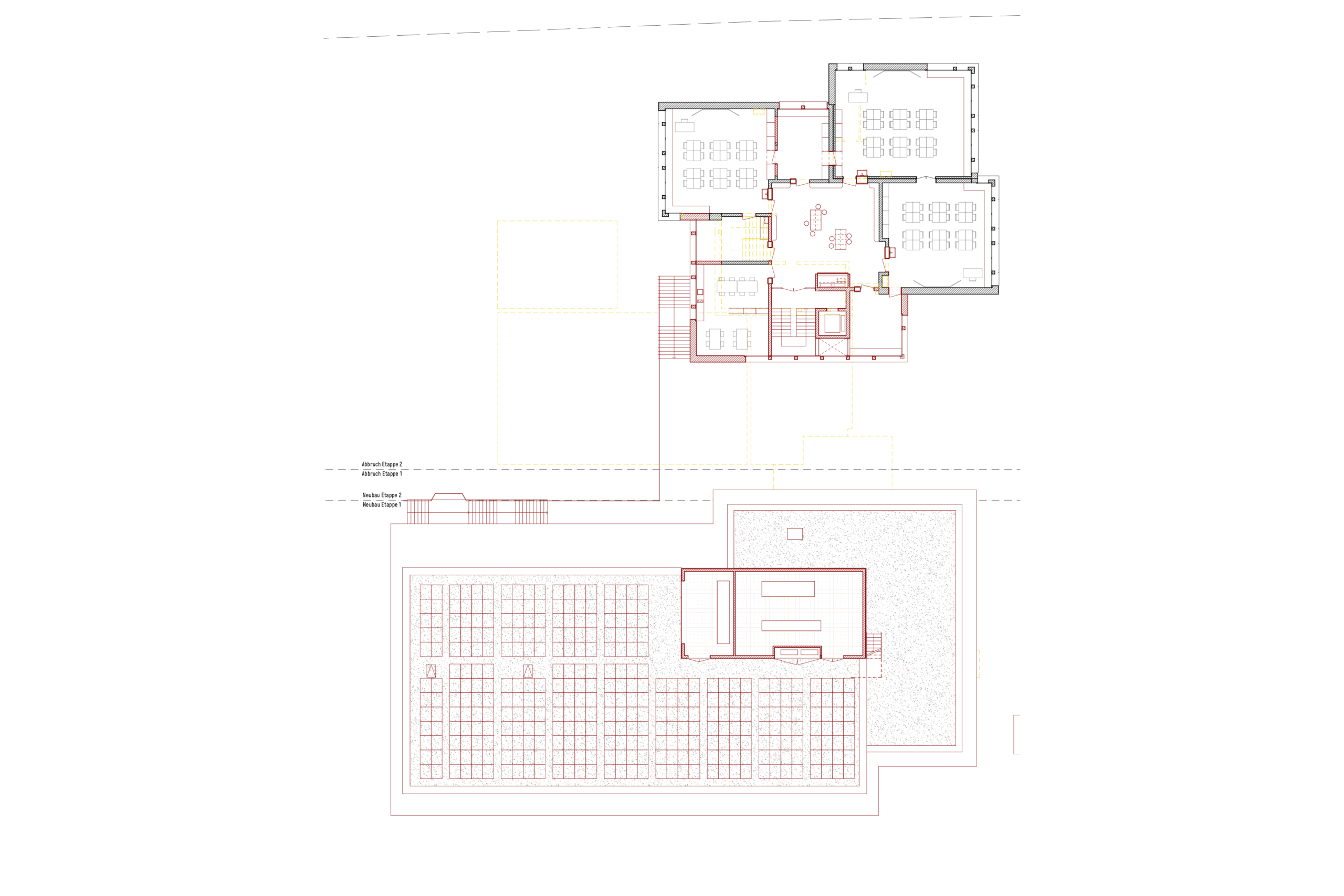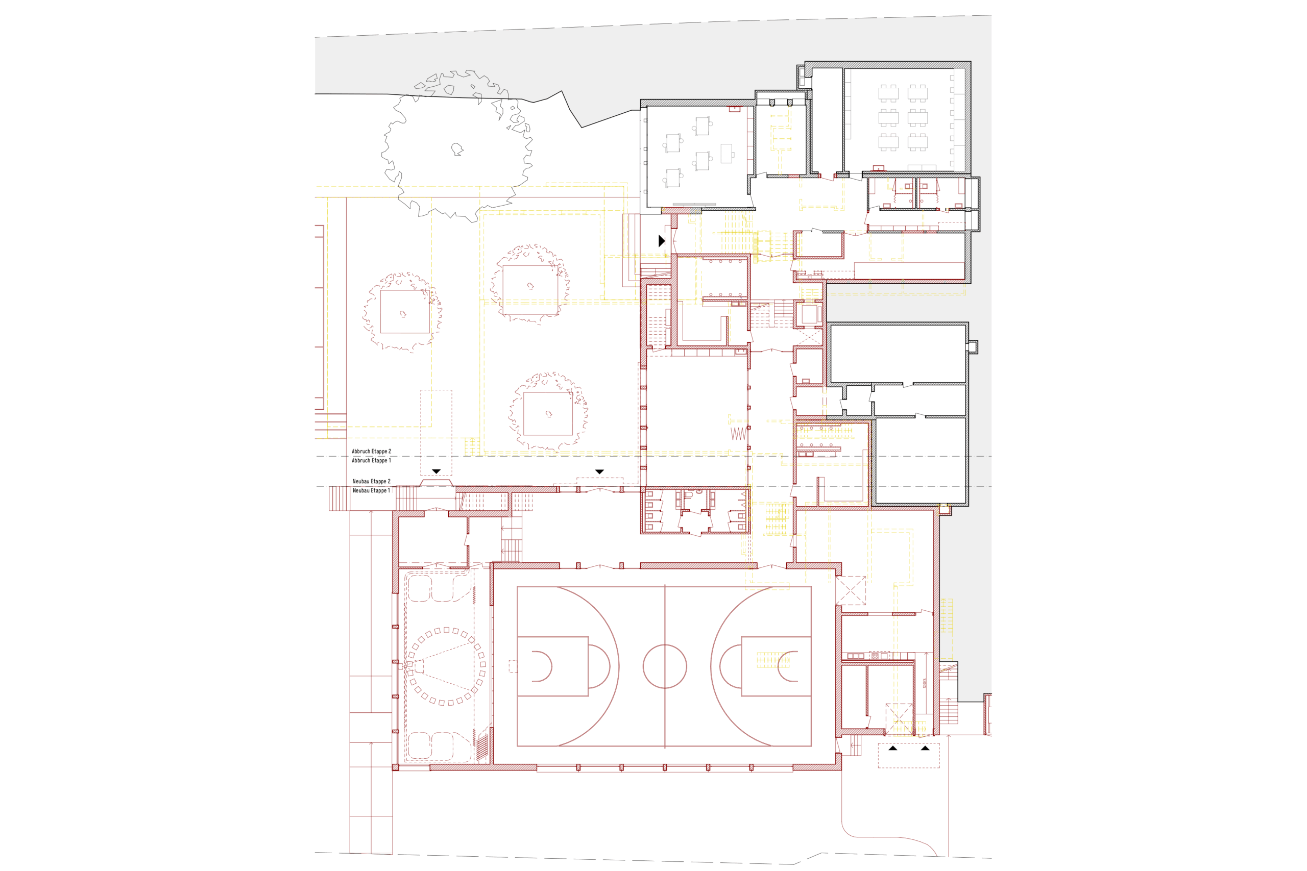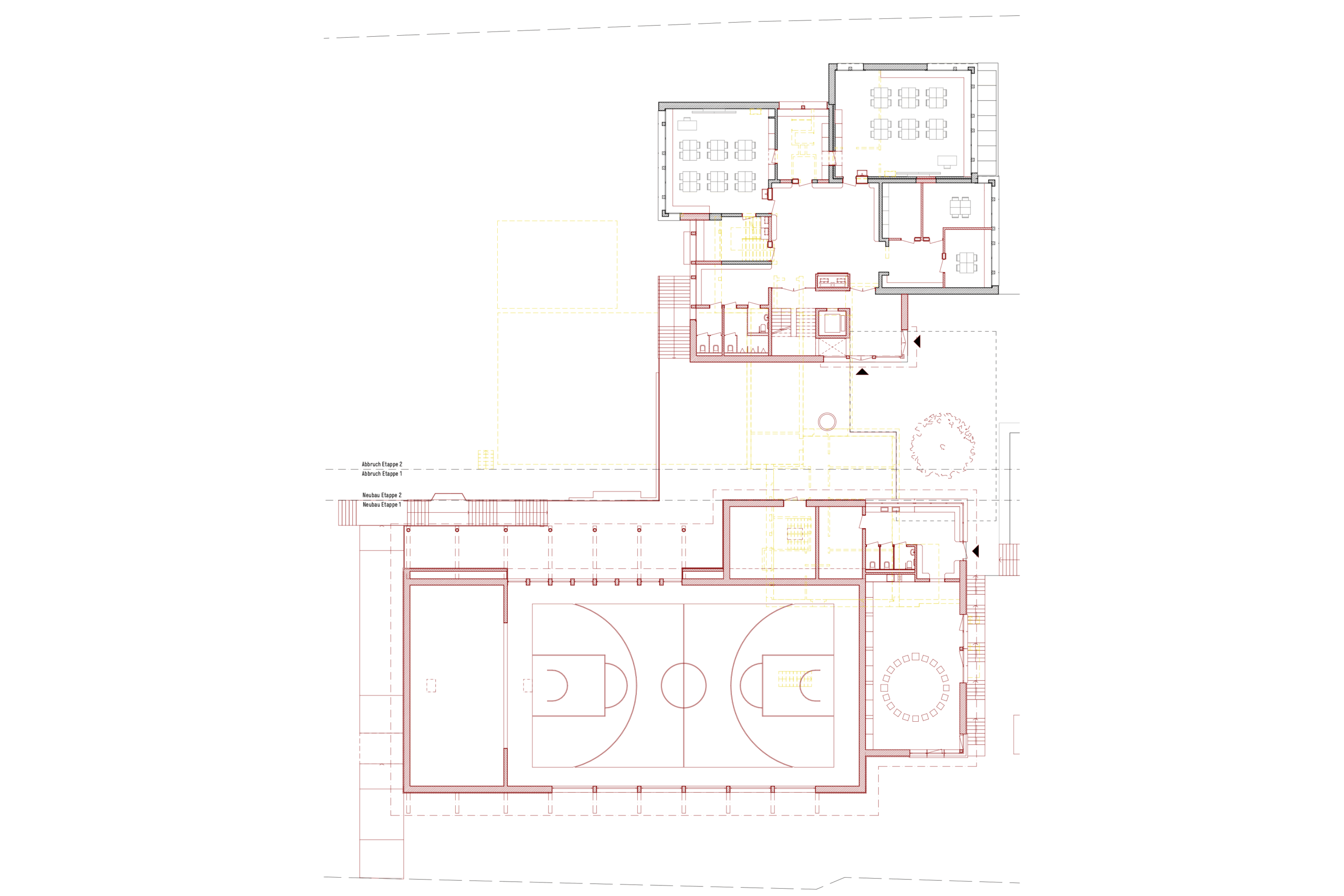 Wir haben uns bemüht, die Eingriffe so klein wie möglich zu halten, die Erweiterung knapp und integrativ und die ganze Anlage auf eine möglichst zurückhaltende, fast leise Art in ein zukunftsfähiges Ensemble umzuwandeln. Das bestehende Schulhaus, obschon zum Abbruch freigegeben, lassen wir stehen – und versuchen, mit einigen kleinen Eingriffen und einer kleinen Erweiterung die ursprünglichen Qualitäten des Baus wiederzufinden und in zeitgemässe Schulräume zu übersetzen. Selbstverständlich lassen wir auch den bestehenden Kindergarten stehen. Er funktioniert gut und hat das Ende seiner Lebensdauer längst nicht erreicht. Statt einem Abbruch versuchen wir, seine etwas unglückliche, städtebauliche Setzung in das neue Ensemble einzubinden. Die Erweiterung der Anlage mit einer Mehrzweckhalle, einem Kindergarten und Räumen für die Lehrpersonen erfolgt in einer Holzbauweise, die ihren Ausdruck zwischen der Sprache des Holzbaus, der Geschichte des Ortes und dem erhaltenen Schulgebäude findet.