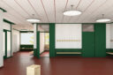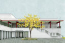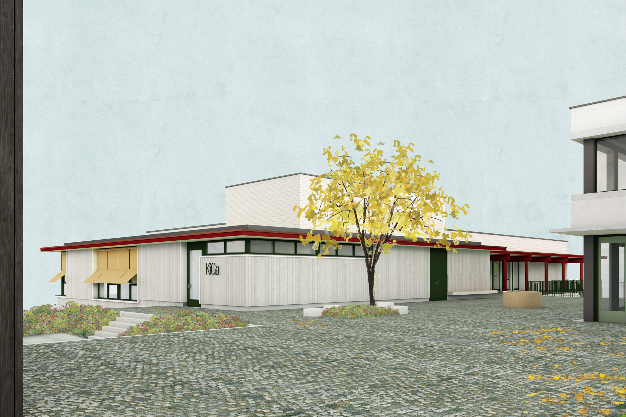 Die Qualitäten des Projekts entstehen aber nicht nur durch die neuen Bauten, sondern vor allem auch durch die Räume, die zwischen den Bauten entstehen. Eine vielfältige Platz- und Raumabfolge entsteht, die auf verschiedenen Ebenen unterschiedliche Funktionen für Schule und Kindergarten, aber auch für das Vereins- und Dorfleben abzudecken vermag. Durch das Zusammenrücken der Bauten werden zudem die Landreserven geschont und der Versiegelungsgrad reduziert.