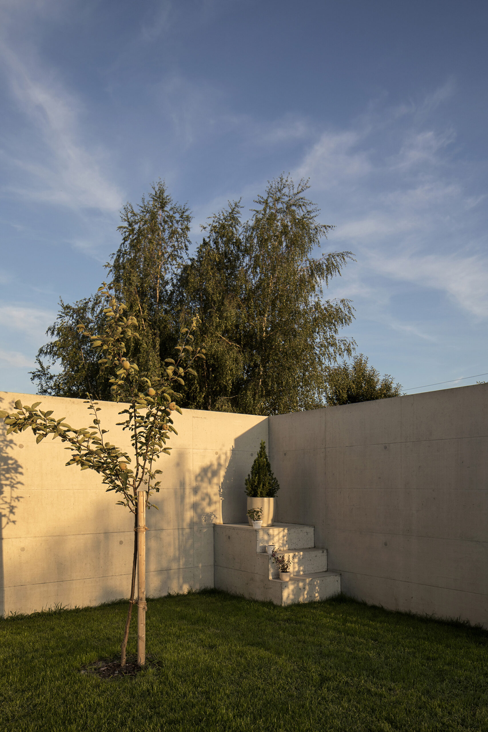 Eine kleine Treppe ermöglicht den Blick über die Mauer. Und sie deckt, ganz banal, die Nische für den Briefkasten ab.