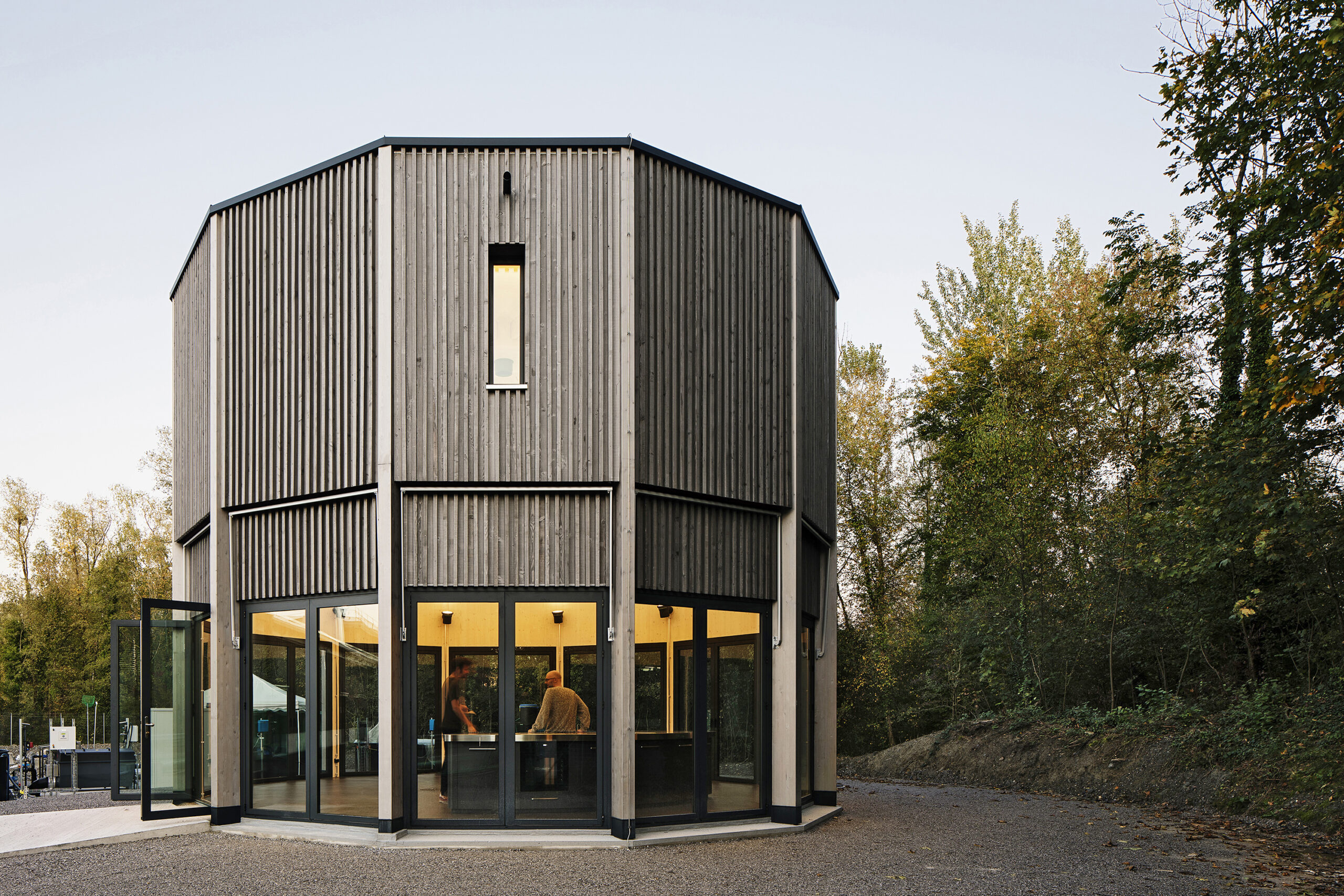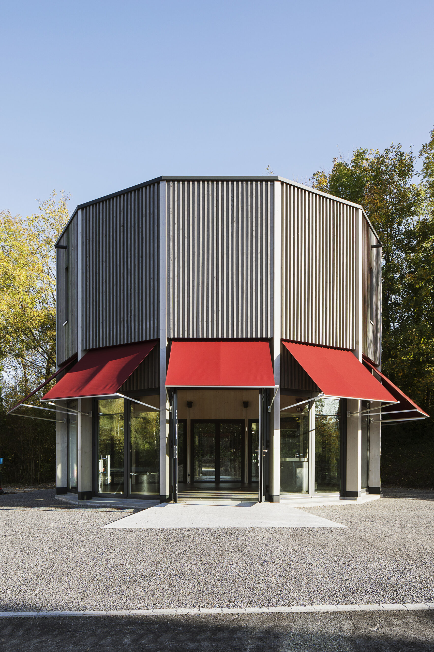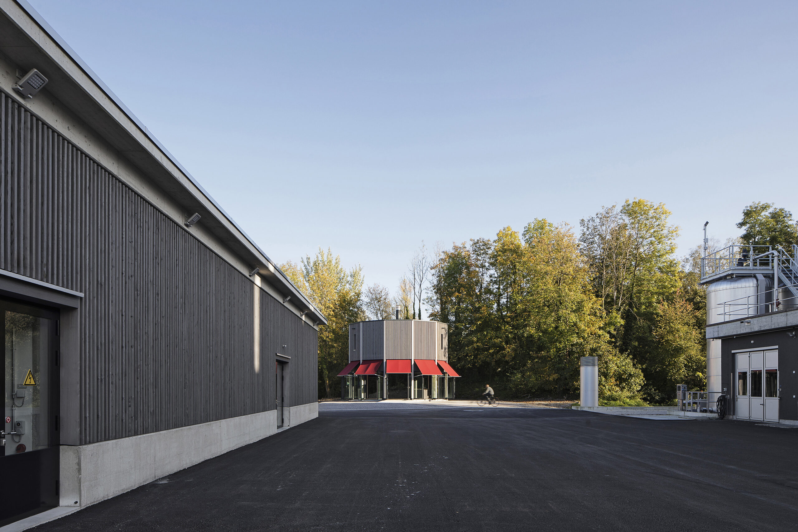 Der Infopavillon erfüllt auch eine ortsbauliche Funktion für das Areal – links der Neubau EMV (vgl. dort)