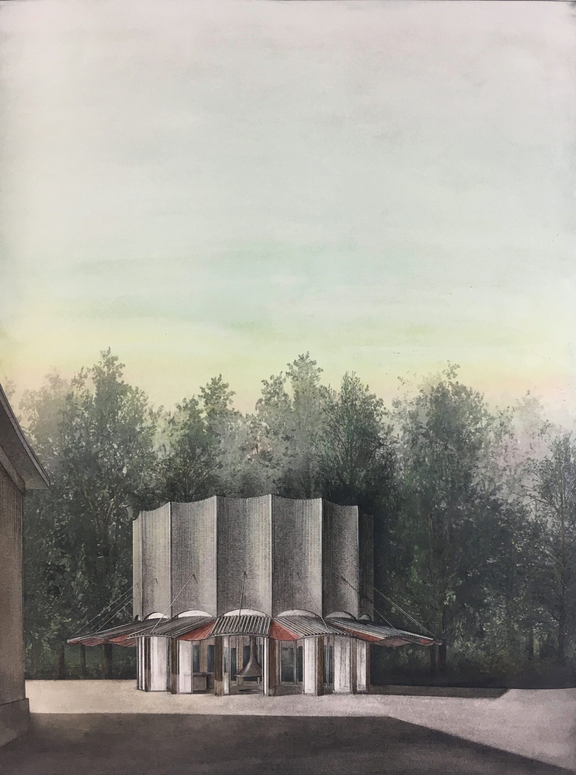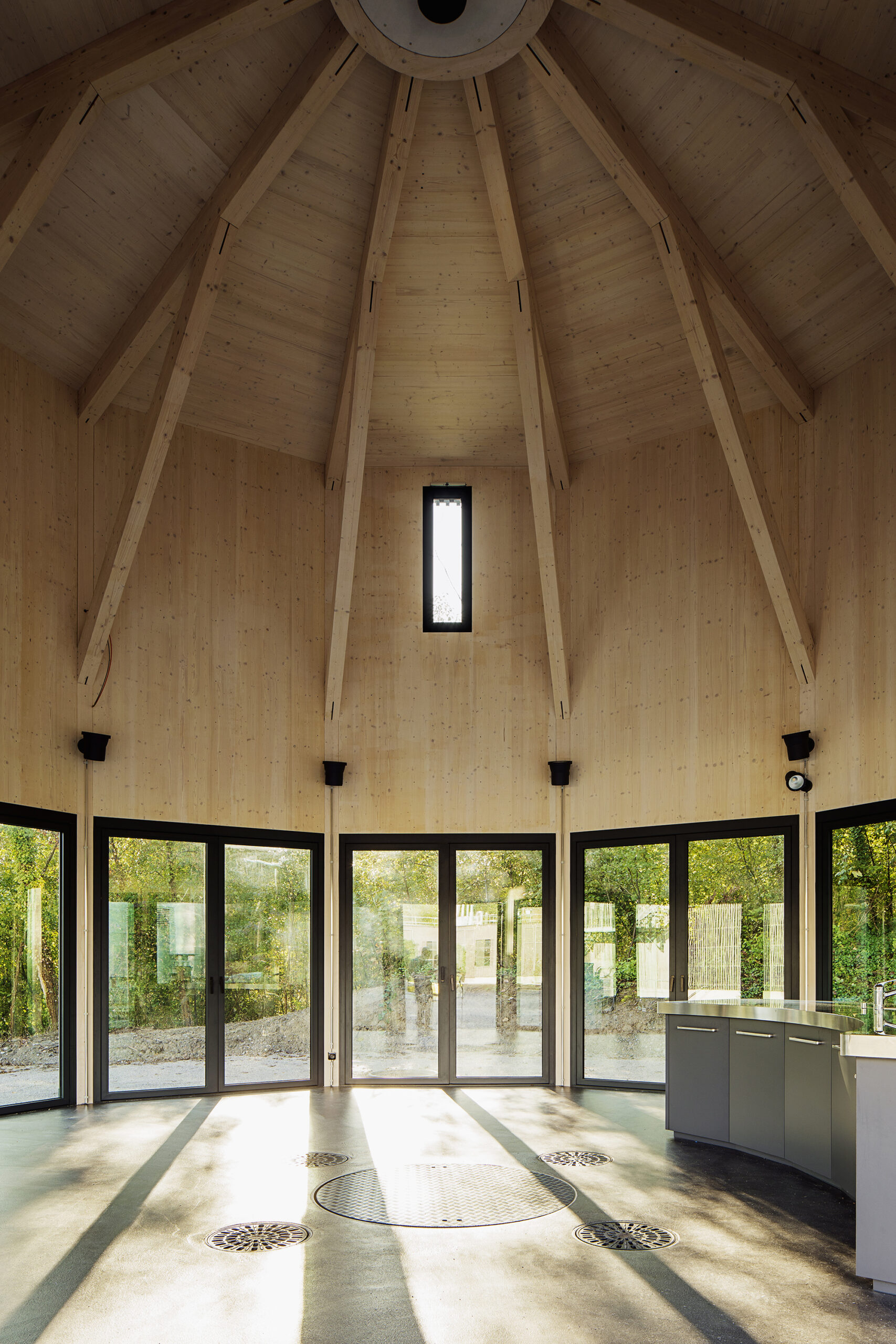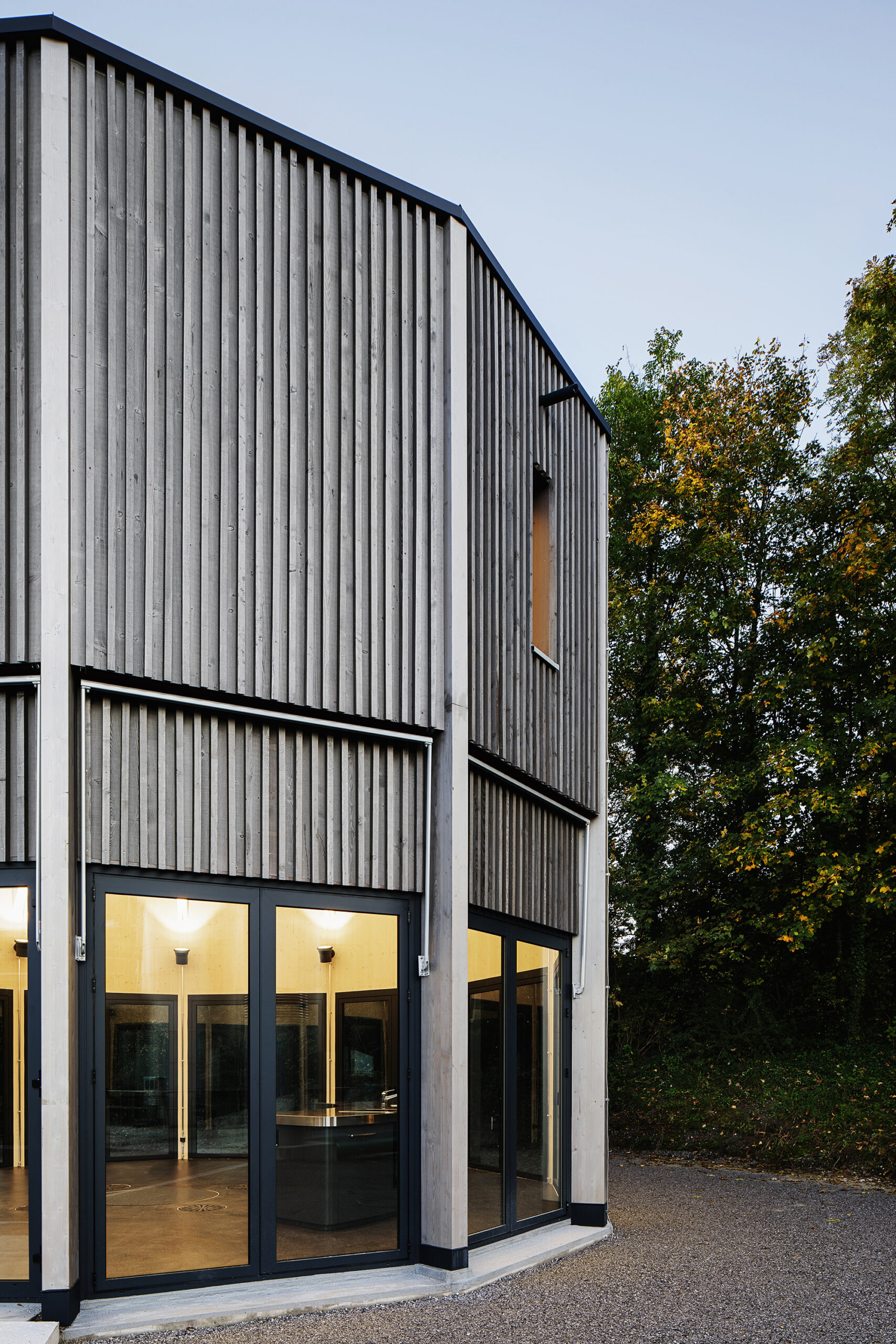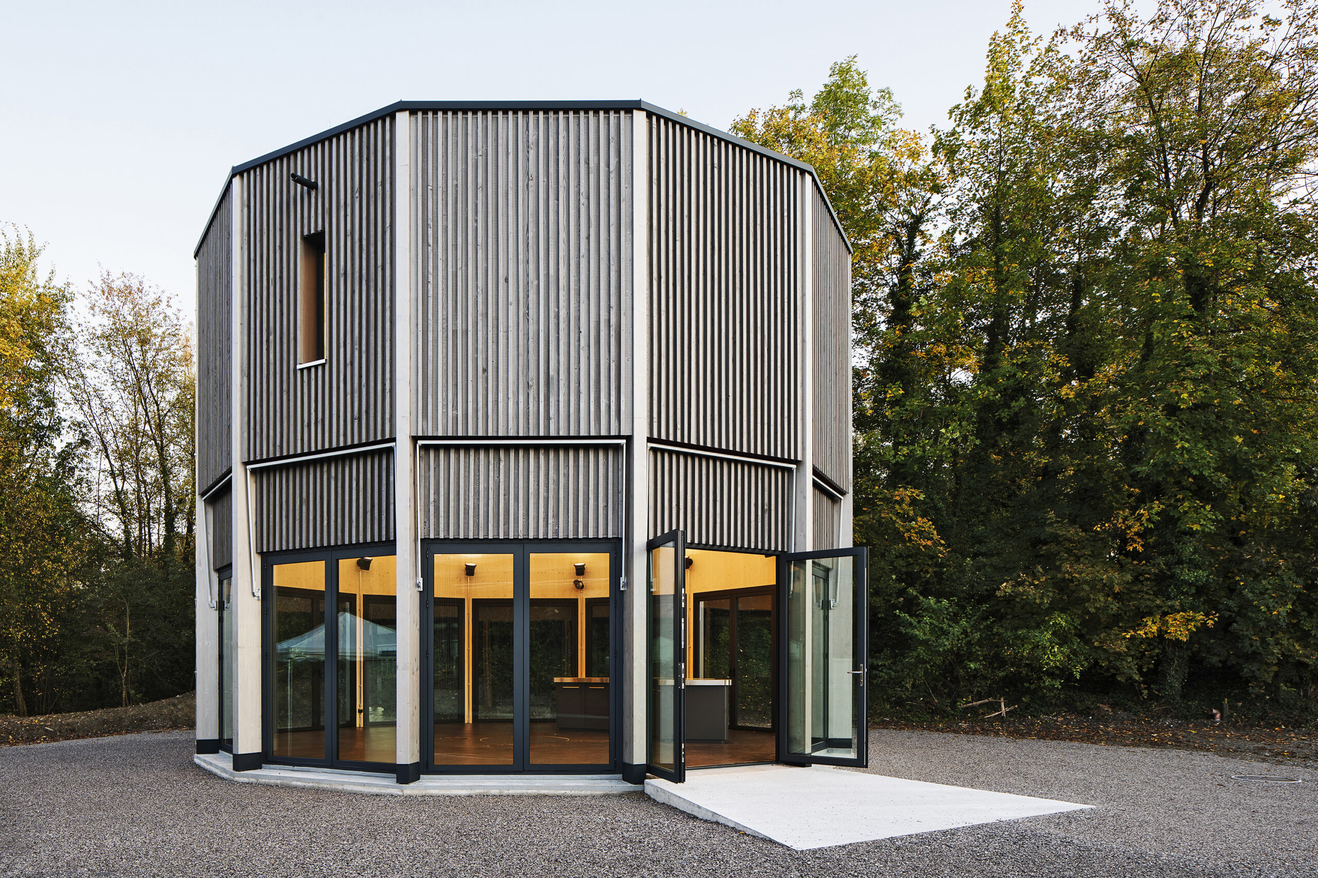 Der Infopavillon erfüllt auch eine ortsbauliche Funktion für das Areal – links der Neubau EMV (vgl. dort)