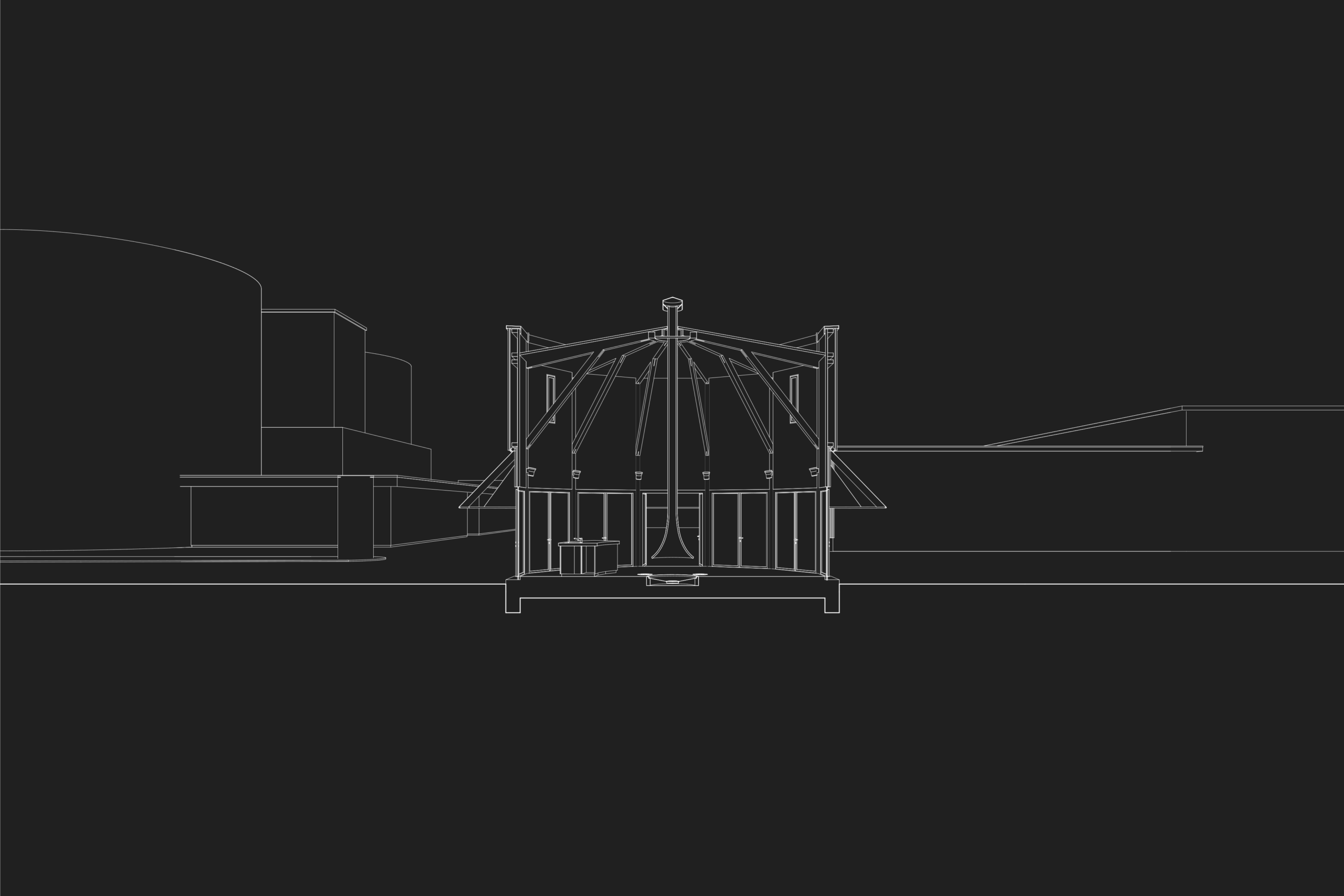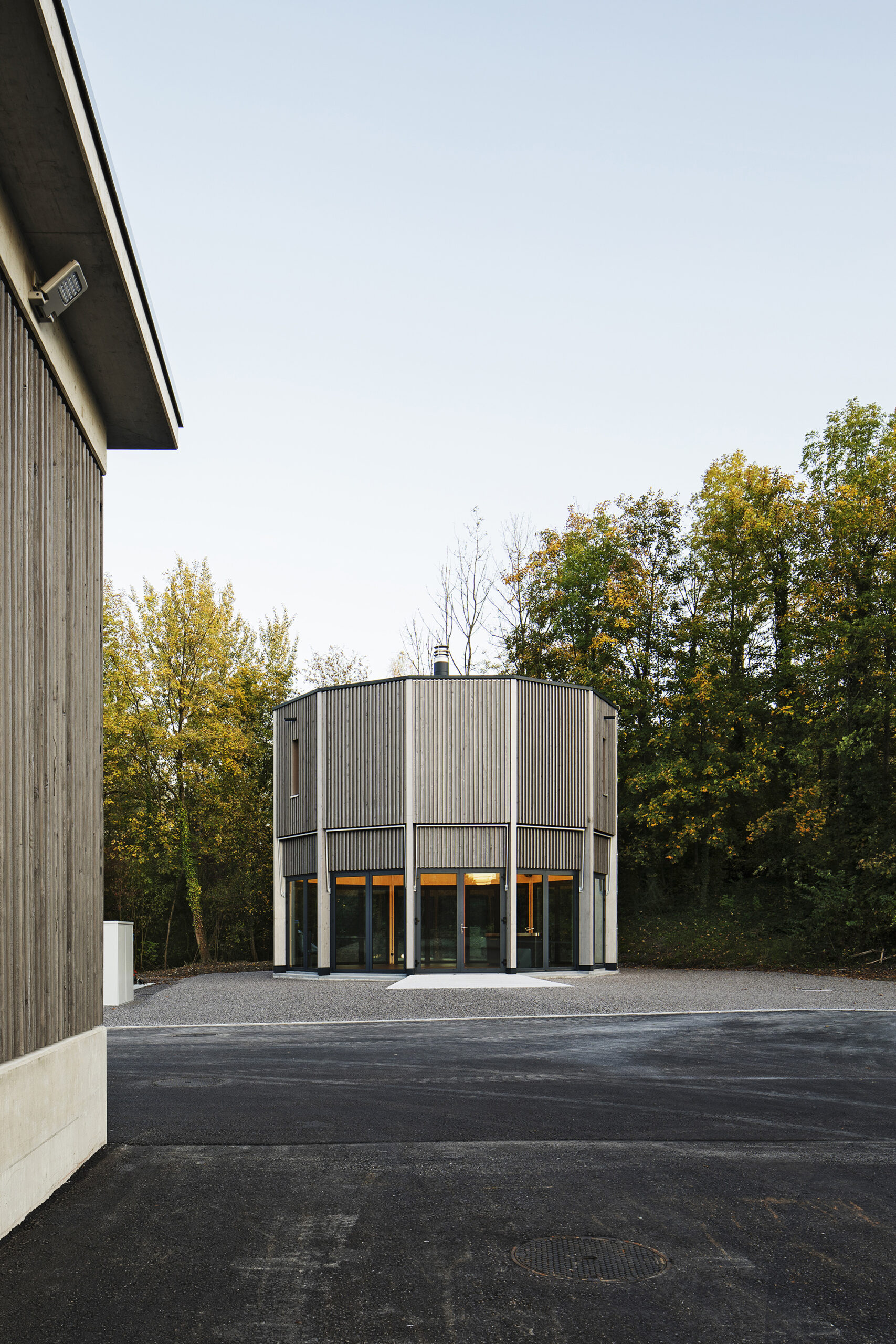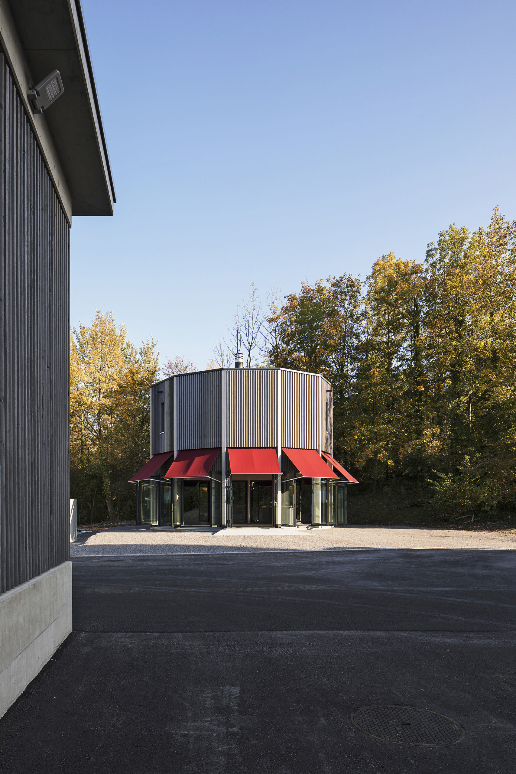 Im geschlossenen Zustand erinnert der Pavillon an die technischen Bauten der unmittelbaren Umgebung