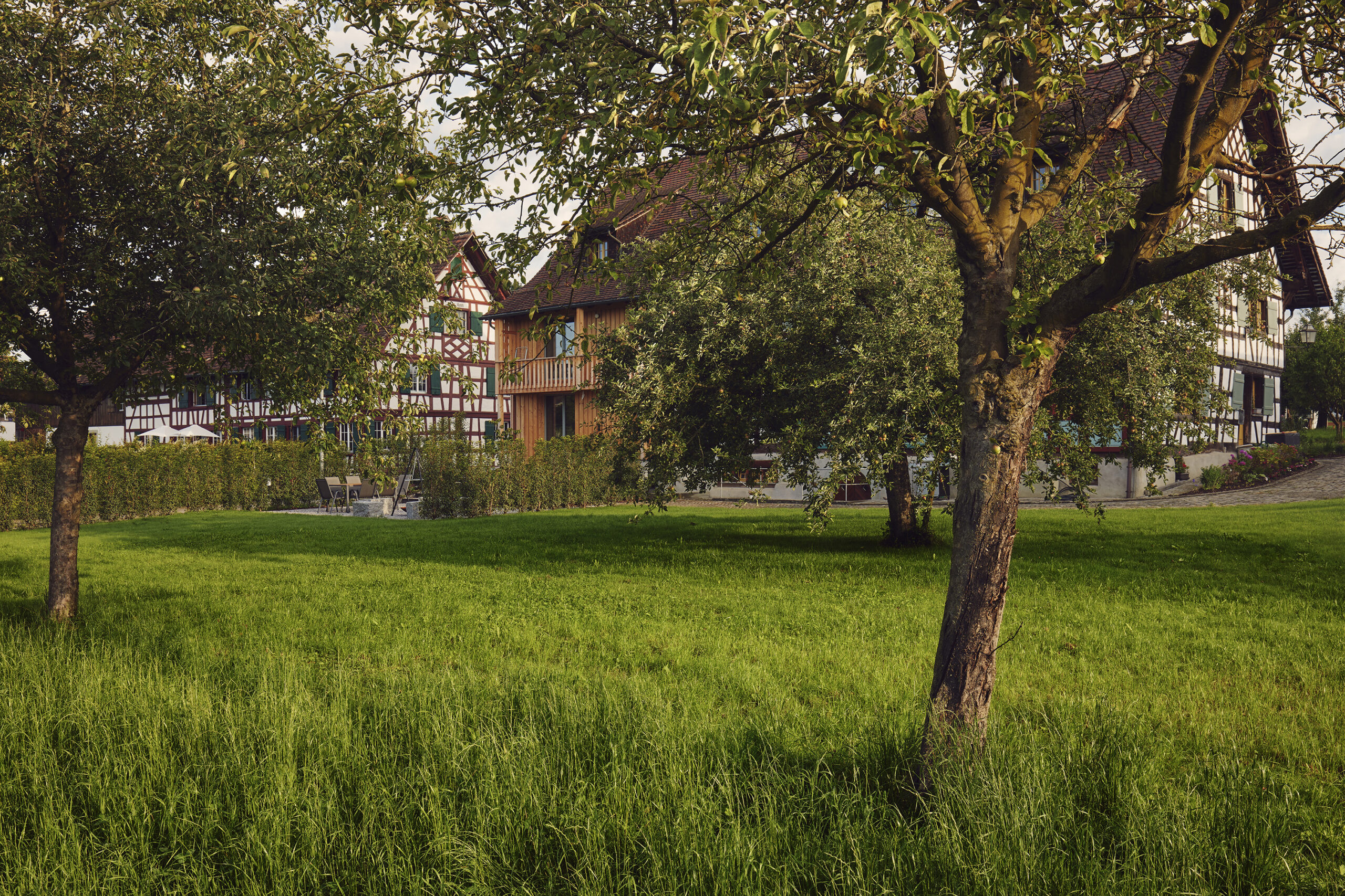 Eine der typischen thurgauer Hochstämmer-Wiese vor dem Ensemble