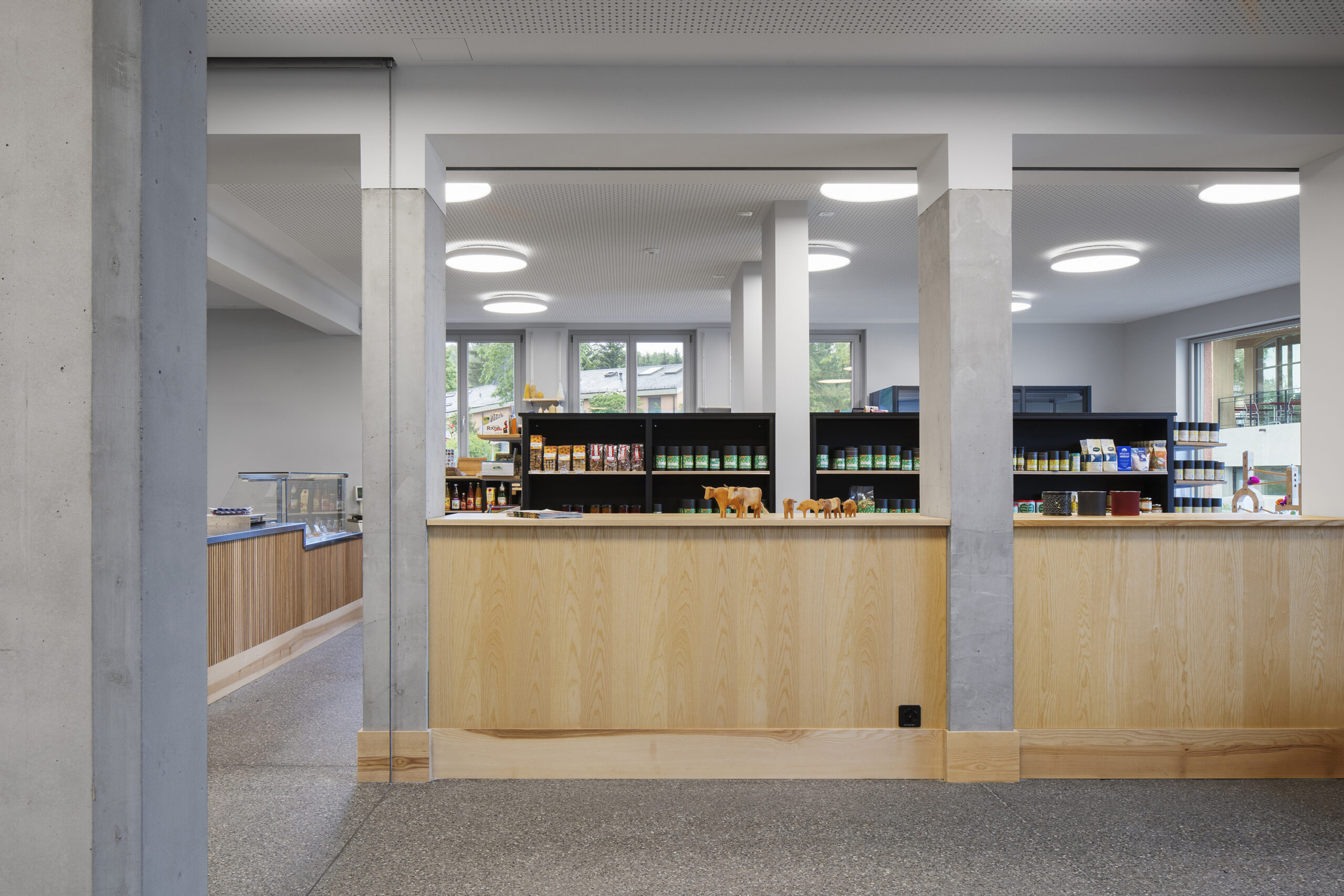 Das Buffet dient nicht nur zum Ausstellen von Produkten, sondern versteckt einen Überzug, der das darunterliegende Schwimmbecken überspannt.