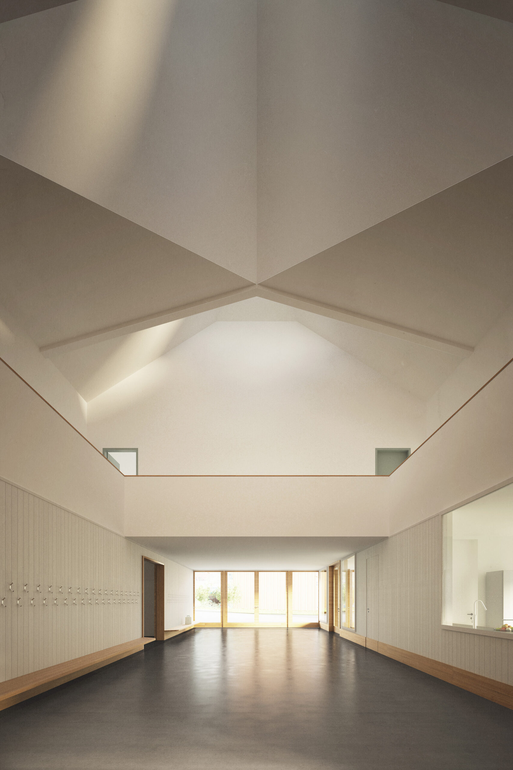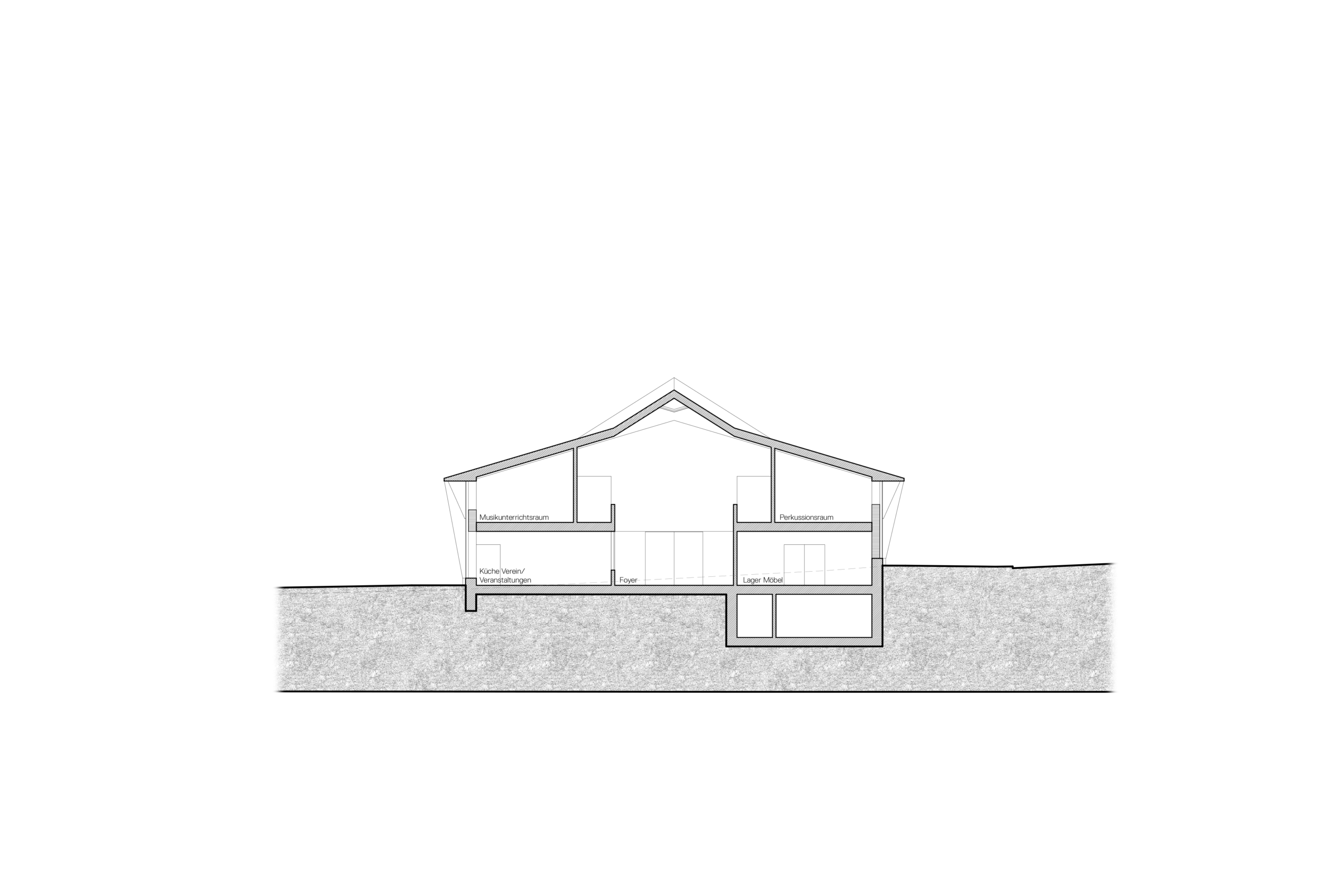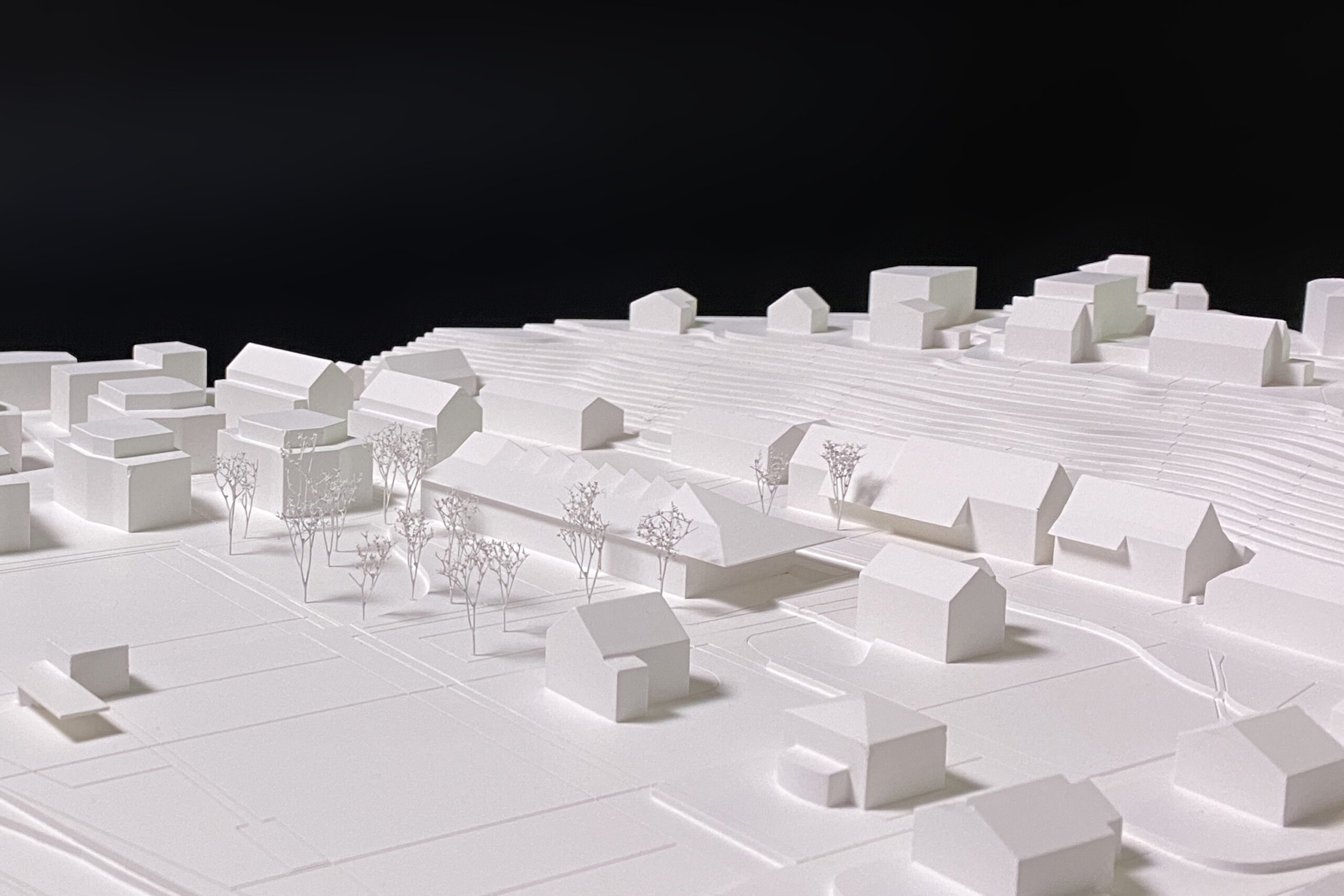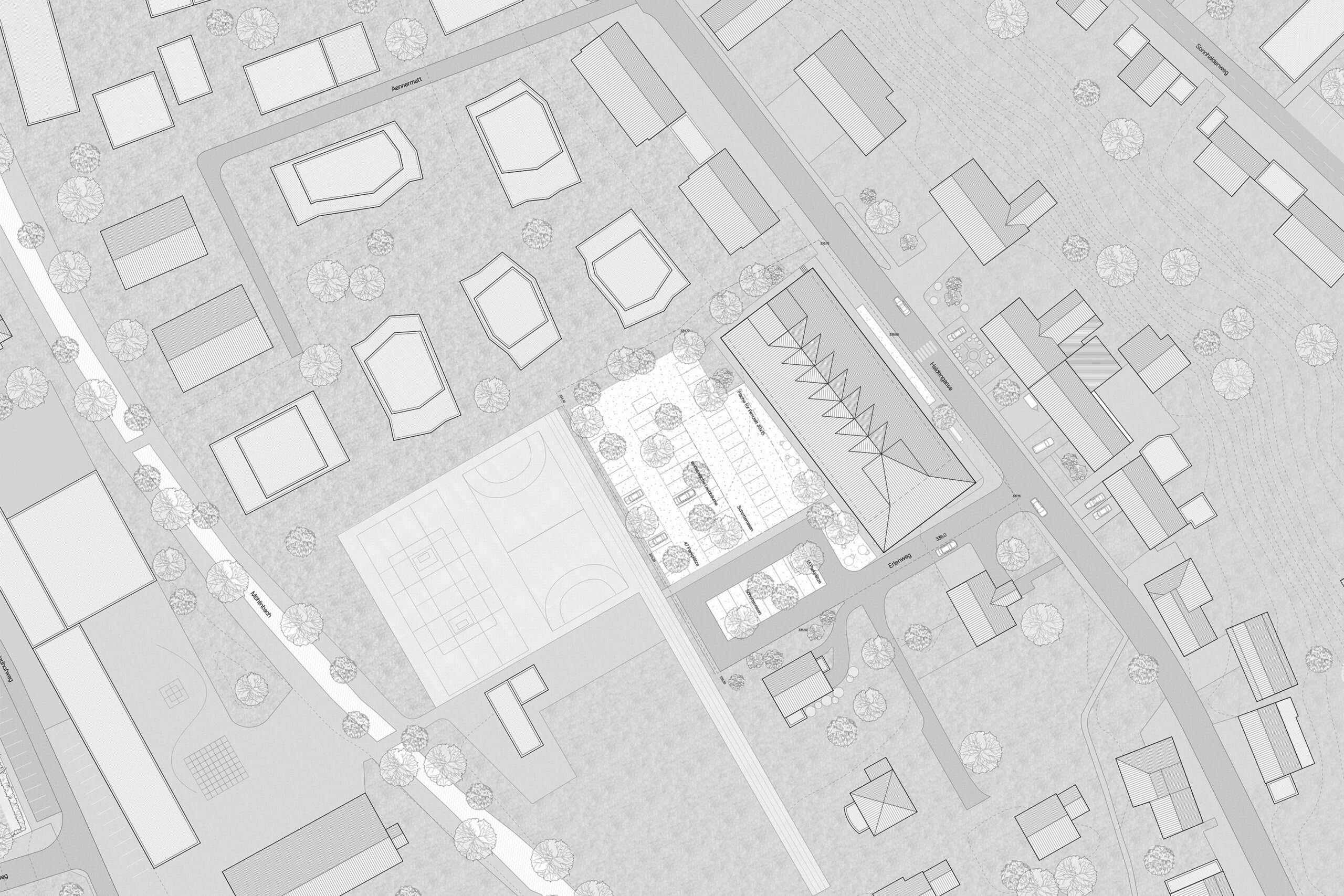 Das Strassendorf wird durch das neue Mehrzweckgebäude komplettiert - ein ortstypischer Strassenraum entsteht. Mit seinem Belag, den Veloplätzen, dem Brunnen und dem präzis gesetzten Baum entsteht aber kein typischer “Autoraum”, sondern ein dörflicher Verkehrsraum. Abgegrenzt davon entsteht zur Schulanlage Brugglismatt ein grosszügiger, ruhiger und grüner Aktivraum, der eine hohe Aufenthaltsqualität verspricht. Im südöstlichen Bereich des Grundstücks schliesslich ist der Haupteingang des Baus an einem öffentlichen Raum angegliedert - er vermittelt unter dem einprägsamen Vordach zwischen Strassen- und Grünraum und ist gut auffindbar. Seine Dimension und die grosszügige Treppe unterscheiden ihn von den Vorbereichen der Privathäuser und zeigt seine öffentliche Bedeutung.