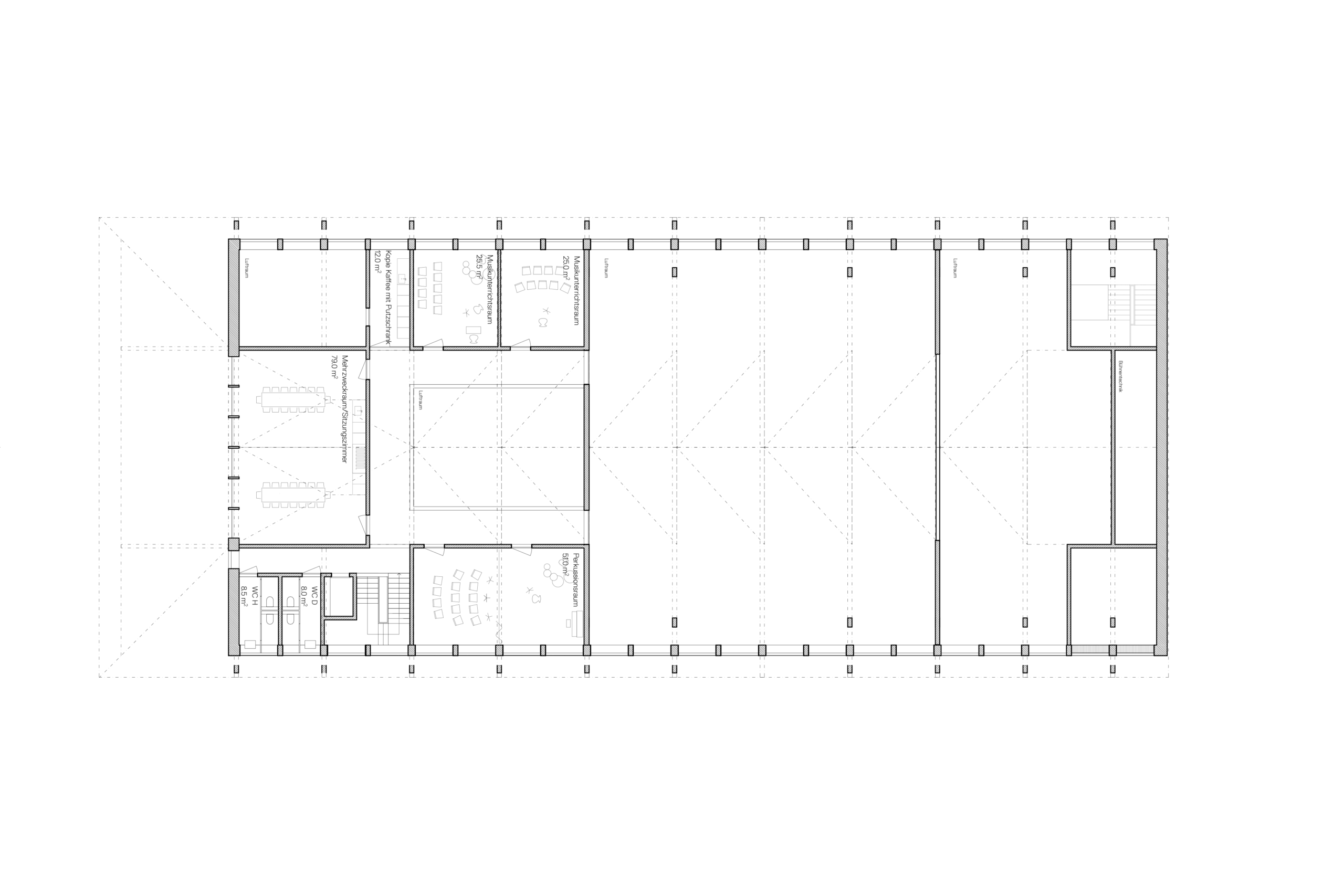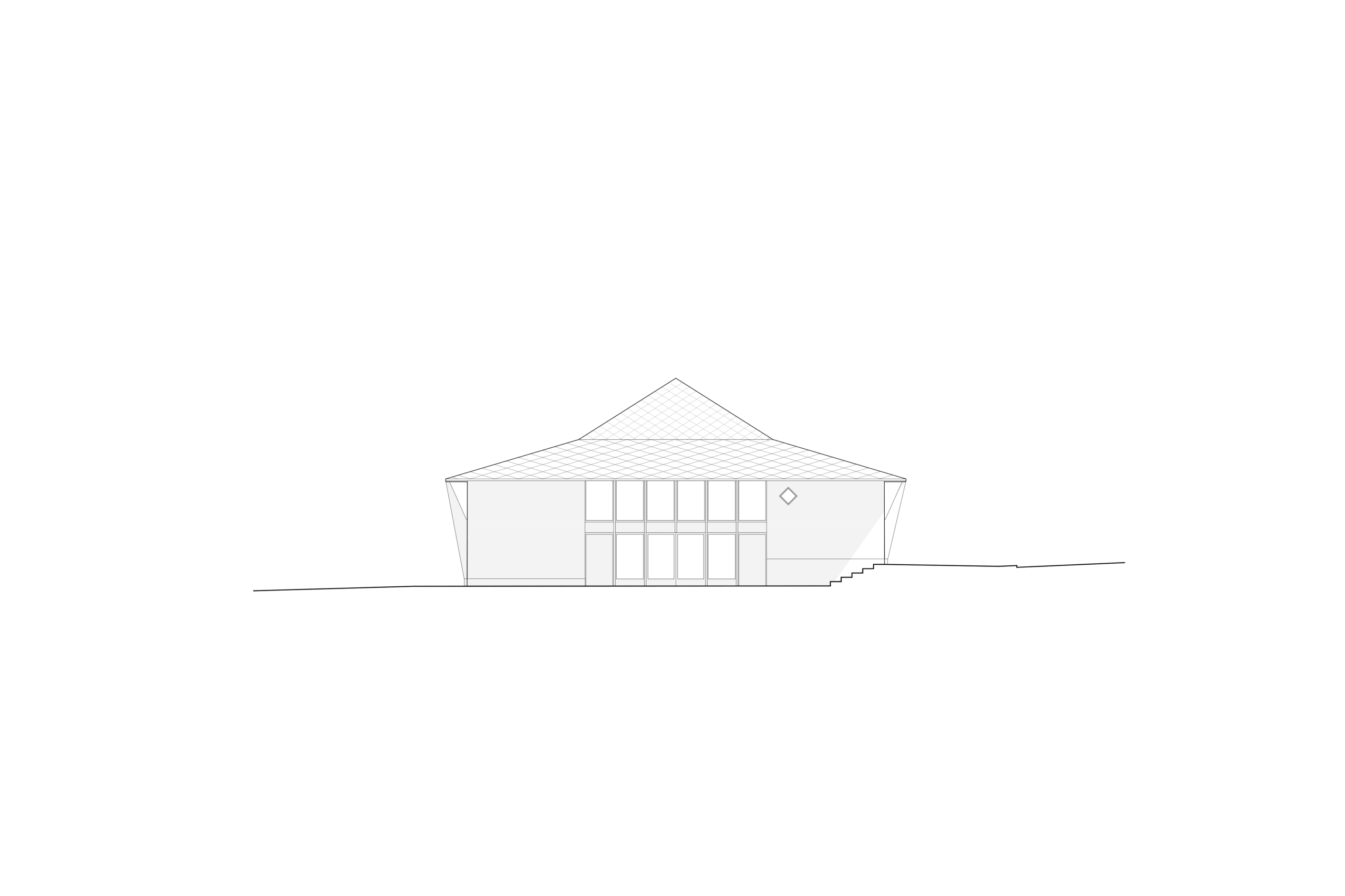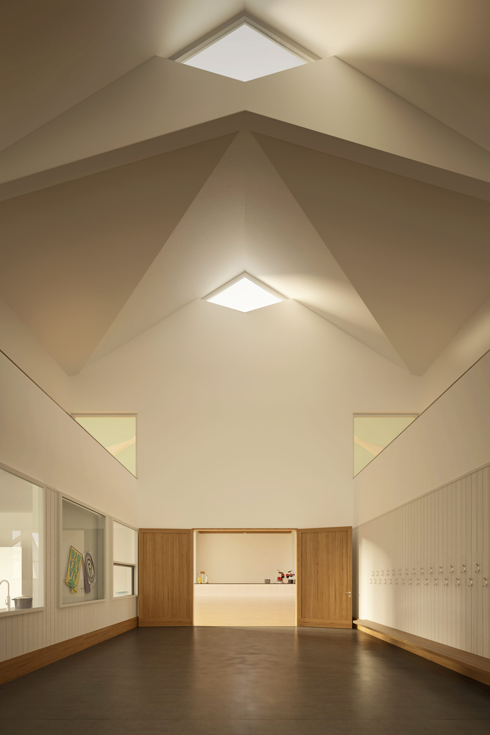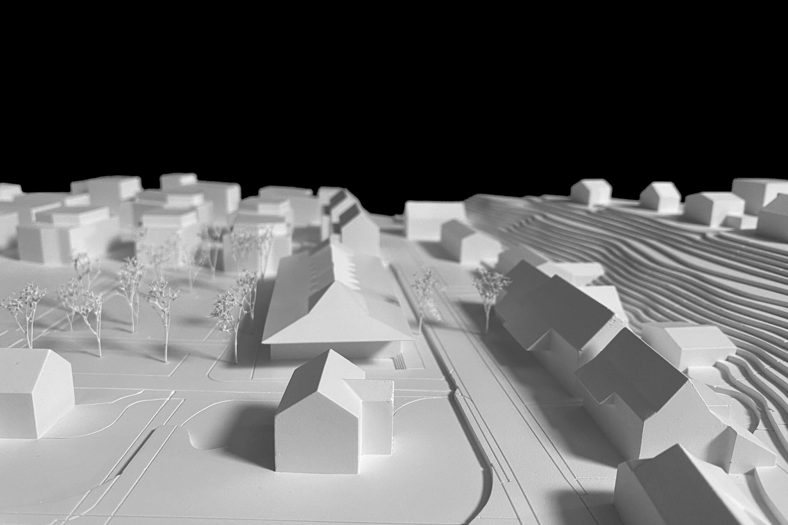 Das Strassendorf wird durch das neue Mehrzweckgebäude komplettiert - ein ortstypischer Strassenraum entsteht. Mit seinem Belag, den Veloplätzen, dem Brunnen und dem präzis gesetzten Baum entsteht aber kein typischer “Autoraum”, sondern ein dörflicher Verkehrsraum. Abgegrenzt davon entsteht zur Schulanlage Brugglismatt ein grosszügiger, ruhiger und grüner Aktivraum, der eine hohe Aufenthaltsqualität verspricht. Im südöstlichen Bereich des Grundstücks schliesslich ist der Haupteingang des Baus an einem öffentlichen Raum angegliedert - er vermittelt unter dem einprägsamen Vordach zwischen Strassen- und Grünraum und ist gut auffindbar. Seine Dimension und die grosszügige Treppe unterscheiden ihn von den Vorbereichen der Privathäuser und zeigt seine öffentliche Bedeutung.