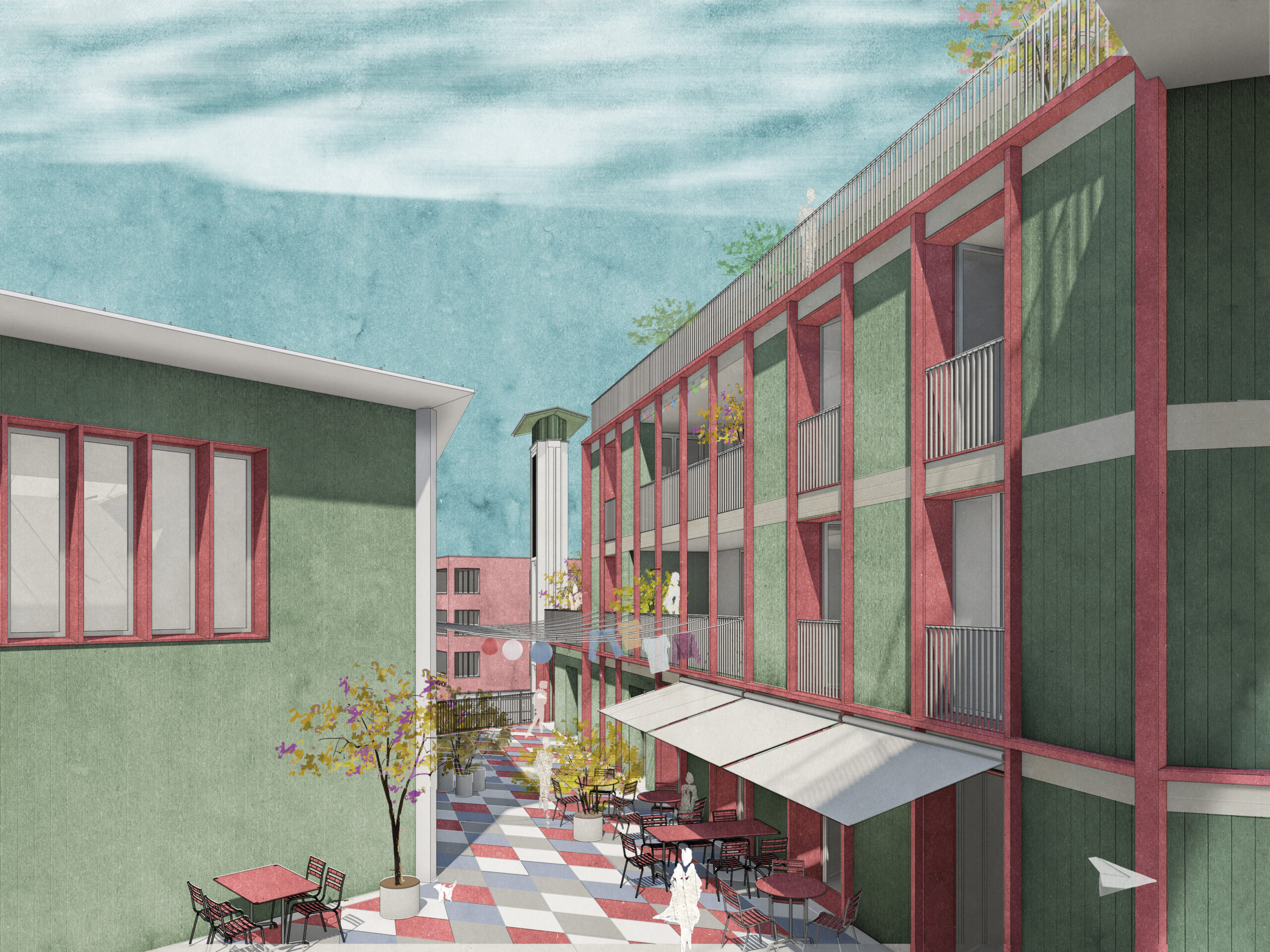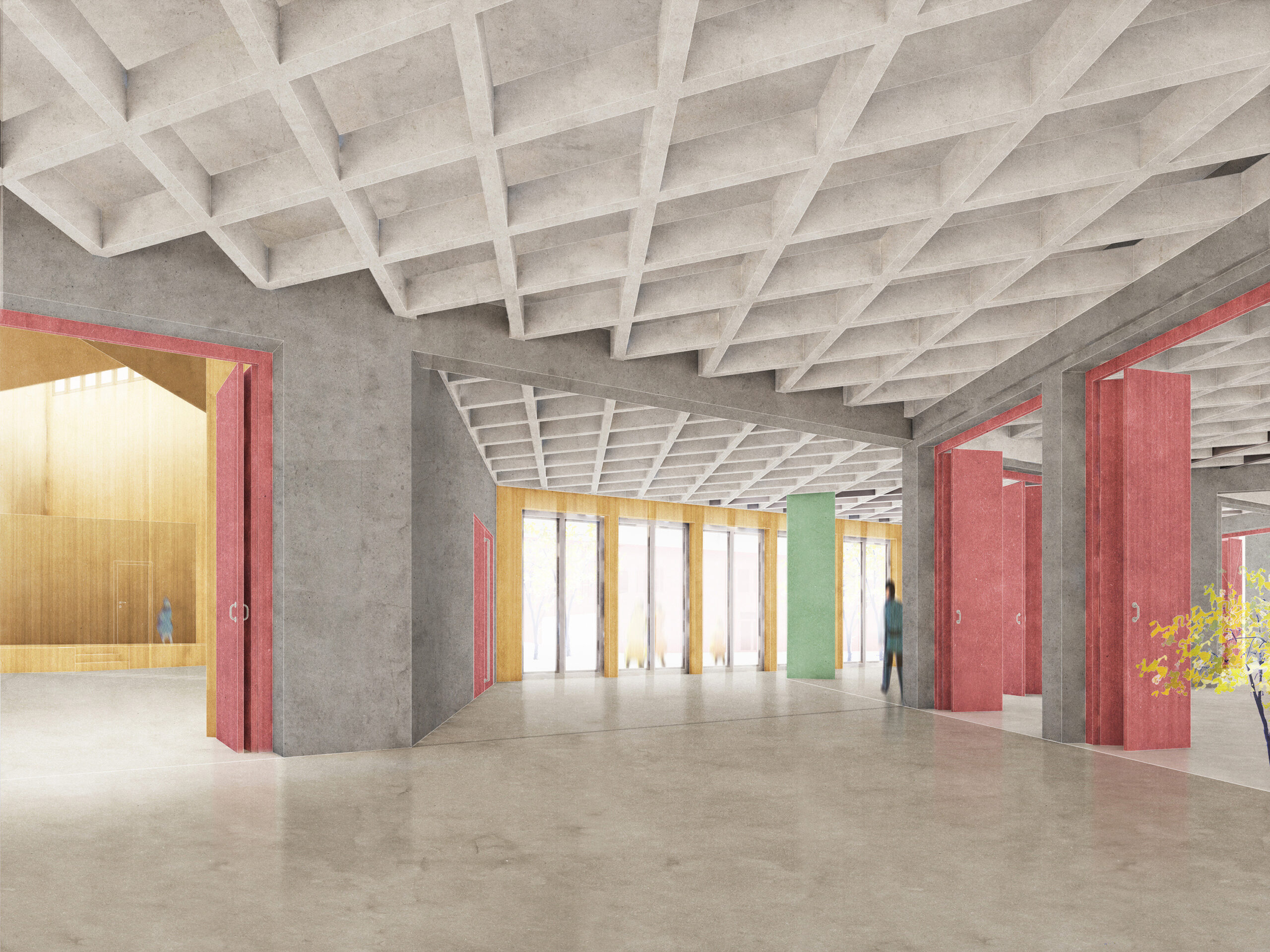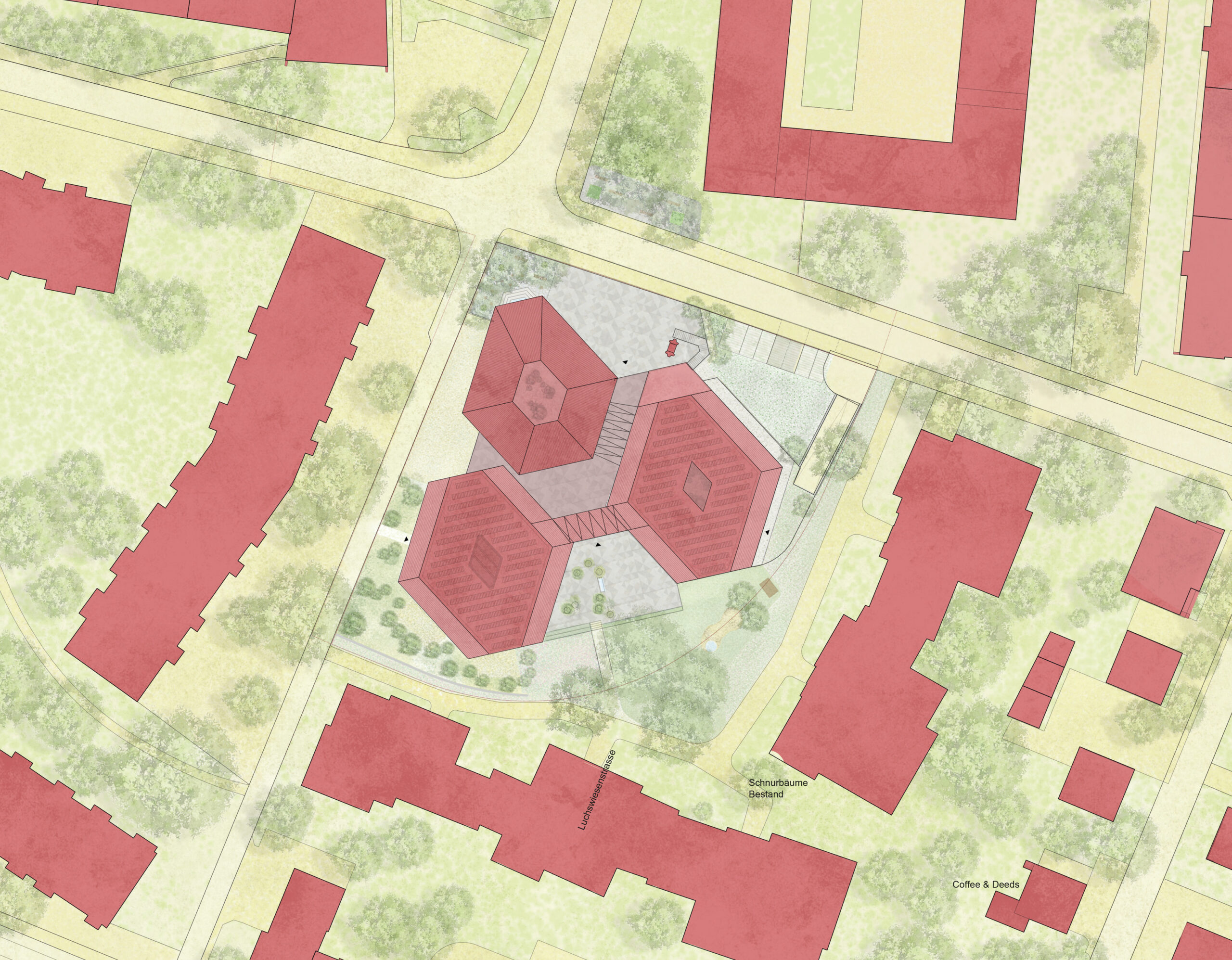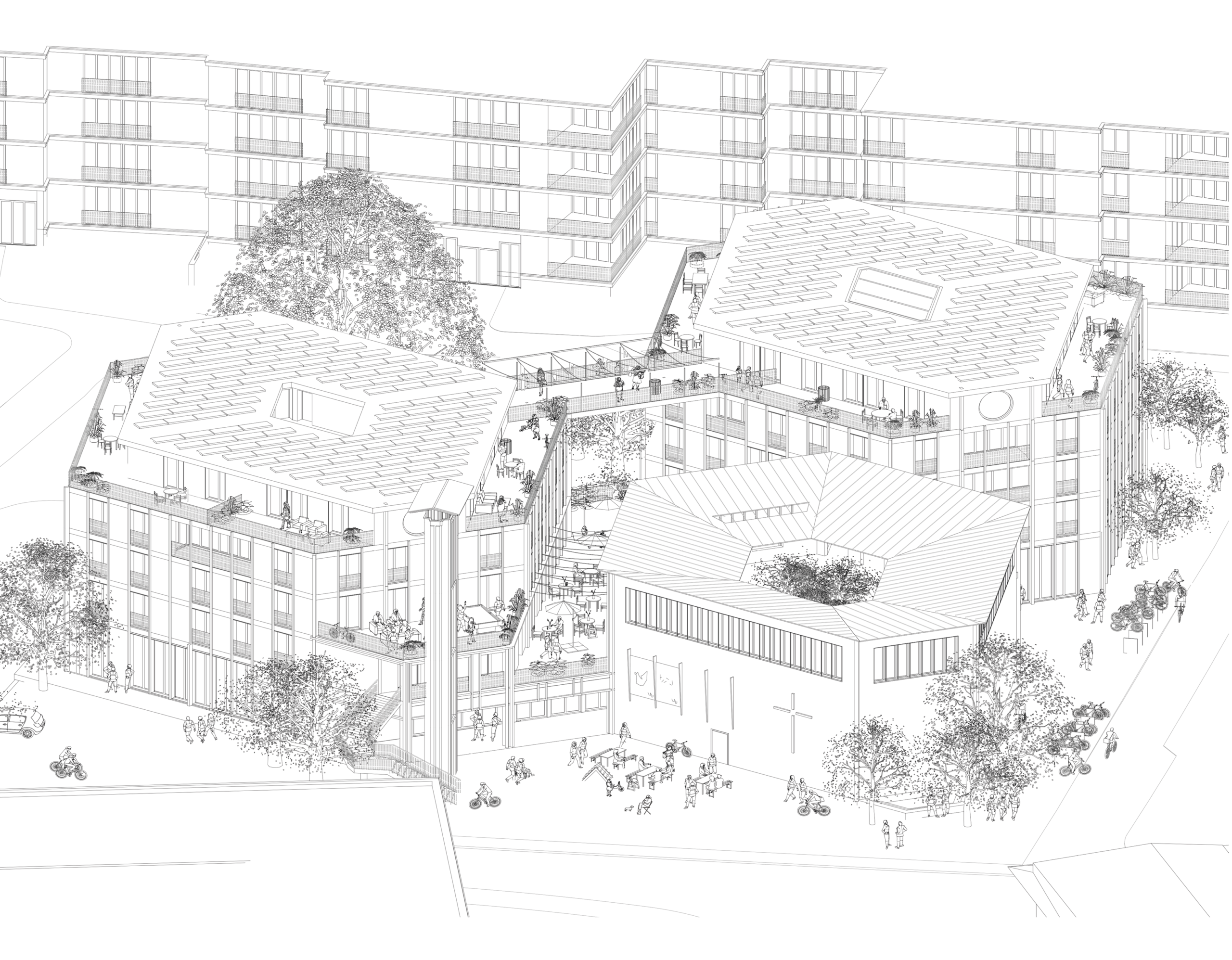 Wir freuen uns sehr, den genau richtigen Wettbewerb zu gewinnen: Was kann man sich schöneres vorstellen, als für die reformierte Kirchgemeinde Zürich-Hirzenbach ein Zentrum mit Wohnungen, Büros, Gastronomie, Co-Workingspace, Indoor-Spielplatz und vor allem einer Kirche zu bauen? Vielleicht ein Zentrum mit all diesen Nutzungen UND einer Kapelle auf dem Dach der Kirche? Genau.